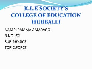 Force is defined as anything that causes an object to move, change speed or direction, or deform shape. A force can make an object move, change direction or speed, or alter its shape. There are several types of forces including gravitational, electrical, magnetic, air resistance, applied, spring, frictional, and normal forces. Each force has a distinct cause and effect - for example, gravitational force attracts objects with mass, while frictional force is present in daily life whenever objects rub against each other.
