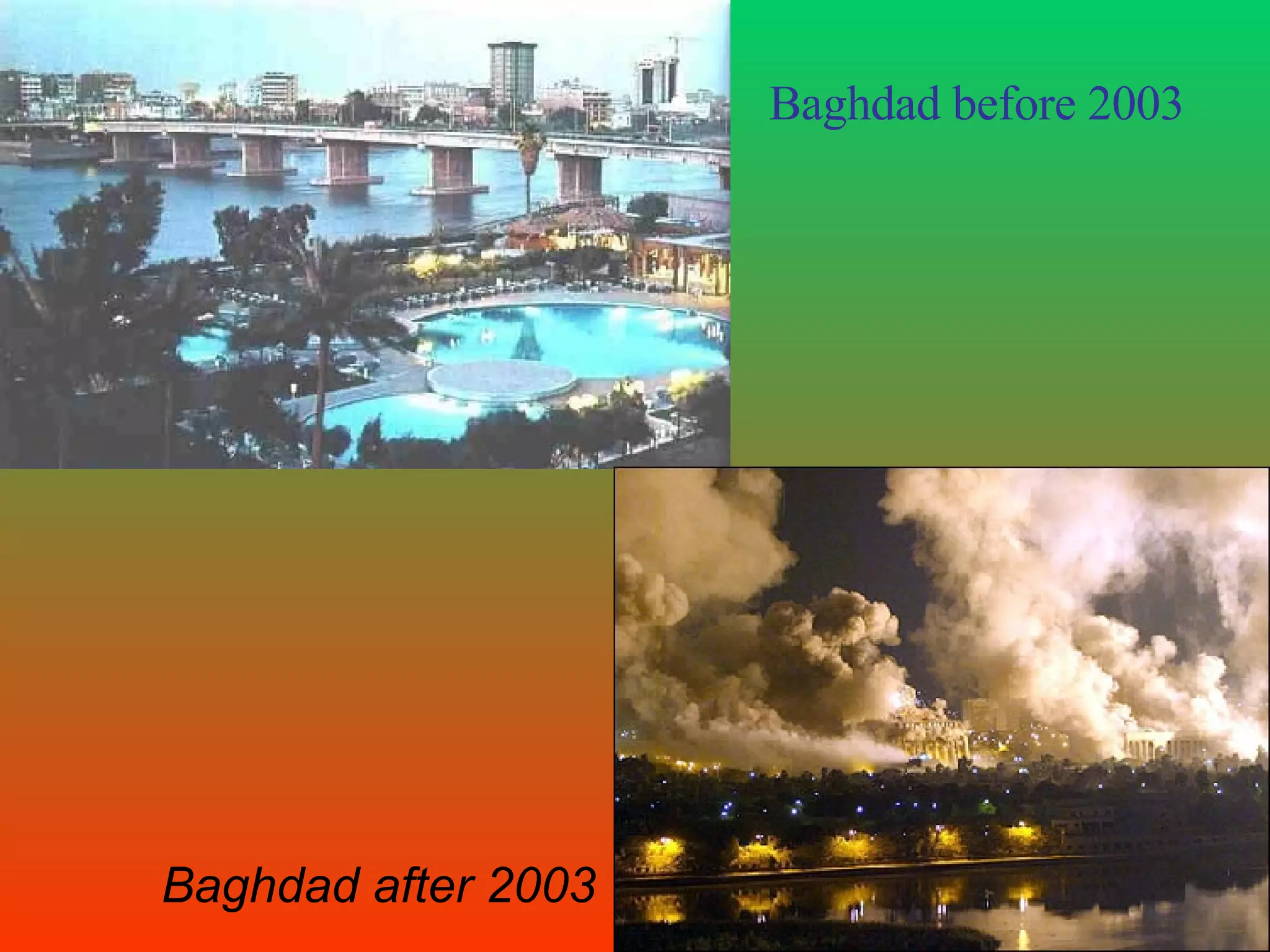 The document contrasts life in Baghdad and other Iraqi cities before and after 2003, noting changes such as increased violence, damage to historical and cultural sites, and deterioration of infrastructure and public services under wartime conditions after the US-led invasion, as well as outflows of refugees and changes to daily life and security.