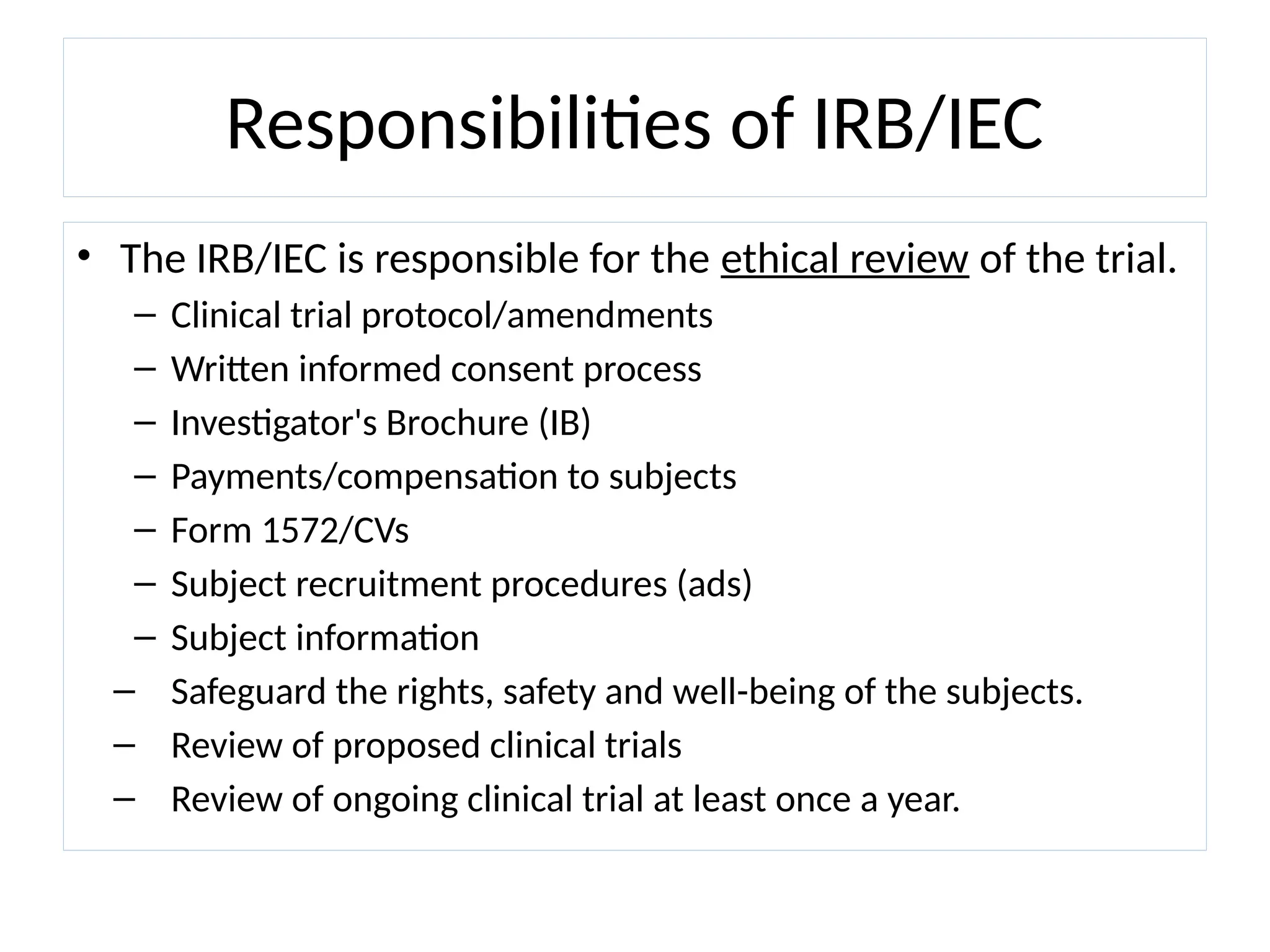 •The IRB/IEC is responsible for the ethical review of the trial.
