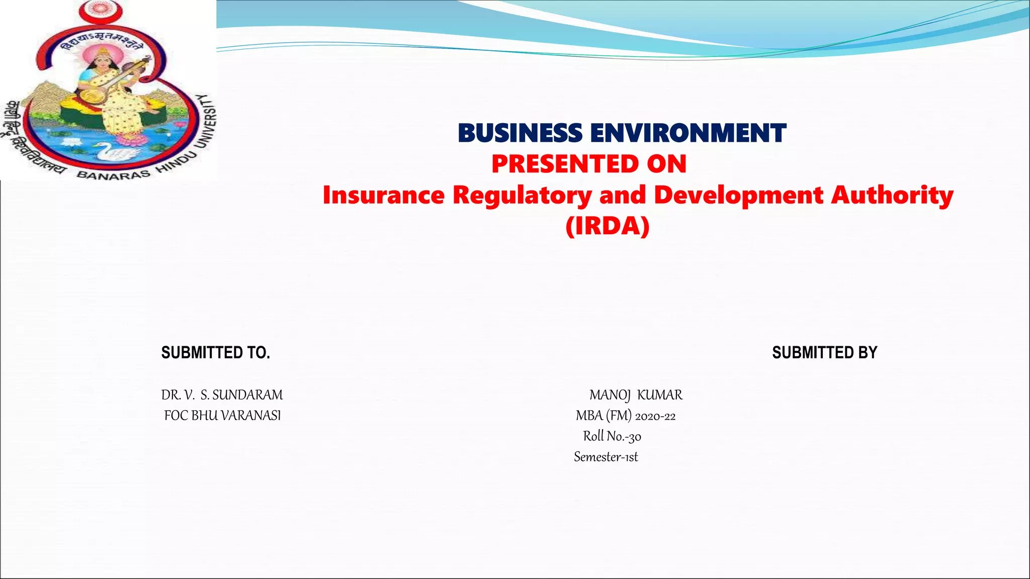 The Insurance Regulatory and Development Authority of India (IRDA) is the insurance regulator in India. It was established in 2000 to regulate and promote the insurance industry. IRDA aims to protect policyholders' interests and ensure the financial soundness of insurance companies. It regulates 31 general insurance and 24 life insurance companies. IRDA's roles include issuing licenses, setting rules and regulations, handling disputes through its ombudsman, and regulating insurance premium rates. It oversees both life insurance (e.g. term plans, retirement plans) and general/non-life insurance (e.g. health, motor, property policies). IRDA has various committees that advise on regulatory matters and handle complaints and disputes.
