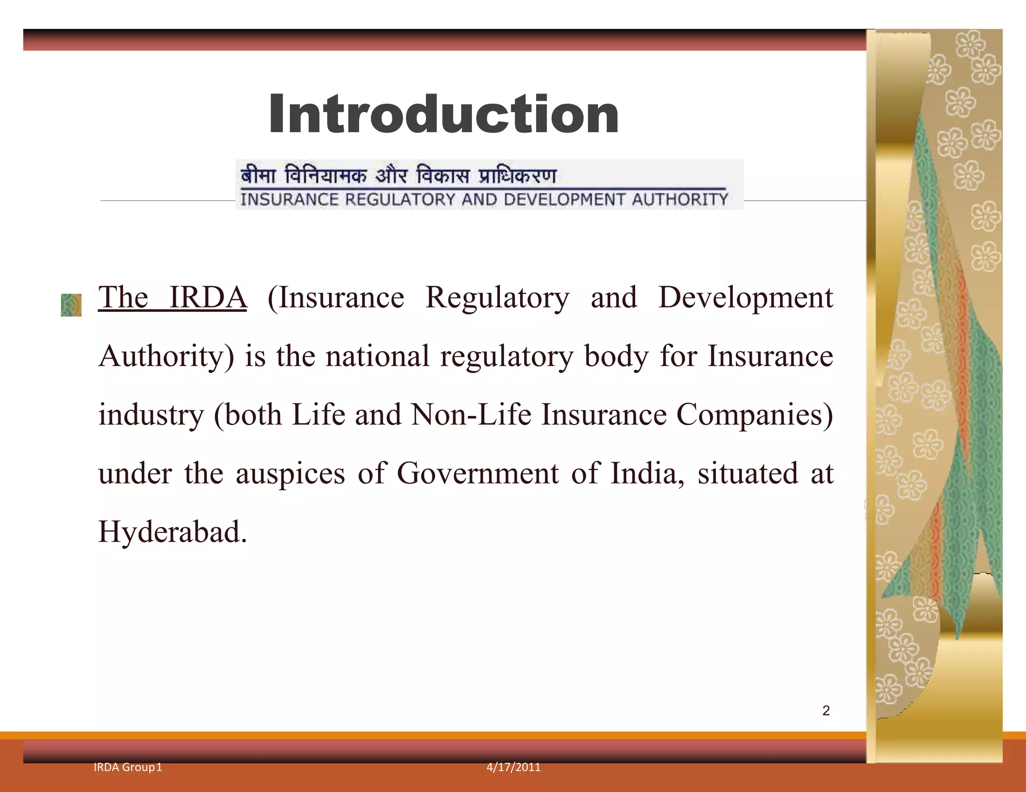 The document discusses the Insurance Regulatory and Development Authority (IRDA) of India. Some key points:
