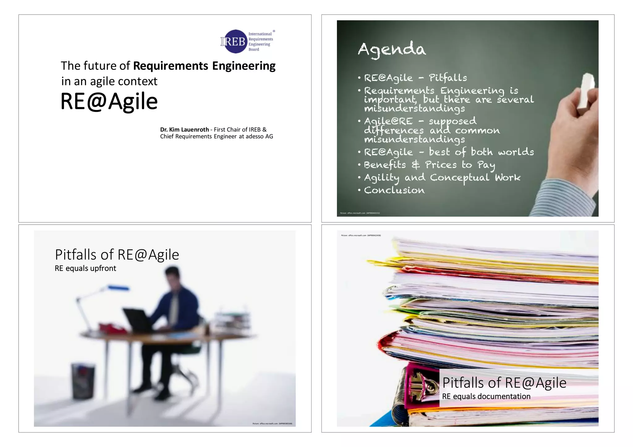 The document discusses the future of requirements engineering in an agile context, highlighting common misunderstandings and the importance of a disciplined approach to managing requirements. It emphasizes the need for effective collaboration between stakeholders and developers, and presents the new re@agile certification combining principles from both requirements engineering and agile methodologies. Additionally, it outlines the benefits of integrating these approaches while acknowledging potential challenges such as knowledge retention and cultural shifts within teams.