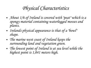 Ireland has a bowl-like shape with about 1/6 covered in peat. The west coast keeps the interior green. Catholics make up most of the population and English is the official language. Soccer and rugby are popular sports. St. Patrick's Day is celebrated annually on March 17 and Shrove Tuesday involves eating pancakes before Lent. Agriculture, including potatoes and beef, is a main economic activity though Ireland entered recession in 2008 with high unemployment. Dublin is the capital located in western Ireland.