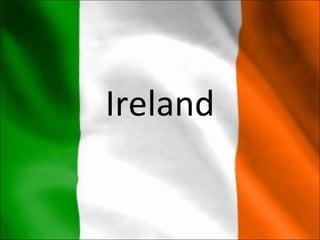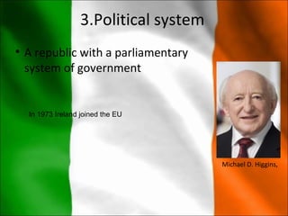 Ireland is a republic with a parliamentary system of government located in Europe. It has a population of over 4.5 million people who are mostly European. The official languages are English and Irish. Ireland joined the European Union in 1973 and uses the Euro currency. Popular traditions include Irish stew, music, and sports like Gaelic football and hurling.