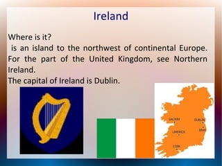 Ireland is an island located northwest of Europe with a population of over 6 million people. Dublin is the capital city and Irish and English are the main languages spoken. Ireland gained independence from the United Kingdom in 1922 after many years of conflict. Some of Ireland's most notable cities include Dublin, Galway, and Limerick, and popular traditions include Halloween and St. Patrick's Day celebrations. Sports such as rugby, rowing, and cricket are an important part of Irish culture.