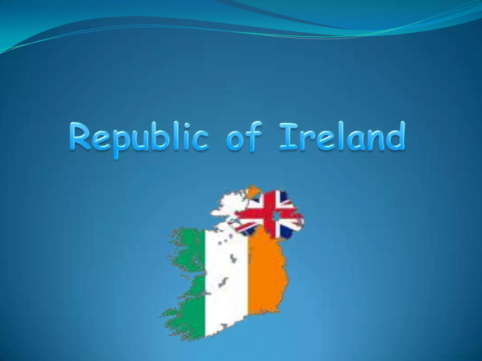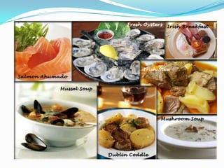 The document provides information about Ireland, including its flag, national anthem, traditional dance, music, gastronomy, and places of interest. It notes that the national anthem is "A Soldier's Song" and the traditional dance is riverdance, known for its rapid leg movements. It describes Irish folk music and mentions dishes like Irish stew, bacon and cabbage, and the Irish breakfast. It highlights Dublin as Ireland's capital and cosmopolitan city, and Killarney National Park as a scenic natural space with wildlife.
