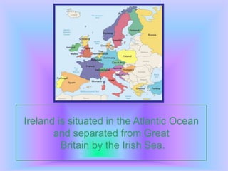 Ireland is an island located in the Atlantic Ocean separated from Great Britain by the Irish Sea. It has 4 provinces and 32 counties. The flag represents Catholics (green), Protestants (orange), and peace (white) between the two groups. The Giant's Causeway formed from an ancient volcanic eruption. Ireland has many historic castles and popular sports include hurling, Gaelic football, and fishing. Traditional Irish food includes breakfast, fish and chips, soups, and stews. St. Patrick's Day is a national holiday celebrated on March 17th. Famous Irish symbols are the leprechaun and shamrock, and Ireland has a rich cultural history of music, dance, and folklore.