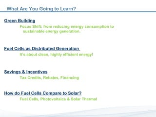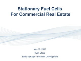 The document summarizes the benefits of stationary fuel cell systems for commercial real estate. Fuel cells provide clean, efficient distributed energy generation that can significantly reduce energy costs and carbon emissions compared to grid power. They operate at a lower cost per kWh than utility rates and can provide both electricity and heat for buildings. Various incentives are available to support the installation of fuel cell CHP systems.