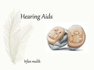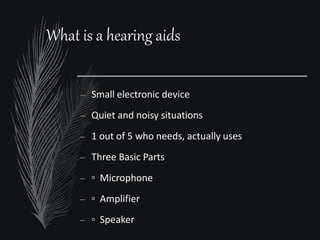 Hearing aids are small electronic devices that amplify sound to help people with hearing loss. They have three basic parts: a microphone that picks up sound, an amplifier that makes sounds louder, and a speaker that sends the amplified sound into the ear. There are two main types of hearing loss - conductive, which is caused by sound being obstructed in the ear and is often treatable with surgery, and sensorineural, which damages the inner ear and is the most common type helped by hearing aids. Modern hearing aids come in various styles like BTE (behind-the-ear) or CIC (completely-in-canal) and can be either analog models or digital models, which have more flexibility to adjust