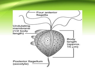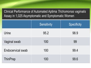 Trichomoniasis is a sexually transmitted infection caused by the Trichomonas vaginalis parasite. It typically infects the genital tract, causing vaginitis in women and urethritis in men. While many cases are asymptomatic, it can sometimes cause symptoms like vaginal discharge, itching, irritation and discomfort during sex or urination. Diagnosis involves microscopic examination or culture of vaginal samples. Treatment is usually with the antibiotic metronidazole. Trichomoniasis is common worldwide but exact case numbers are difficult to determine as it often presents without symptoms and diagnostic tests have limited sensitivity.