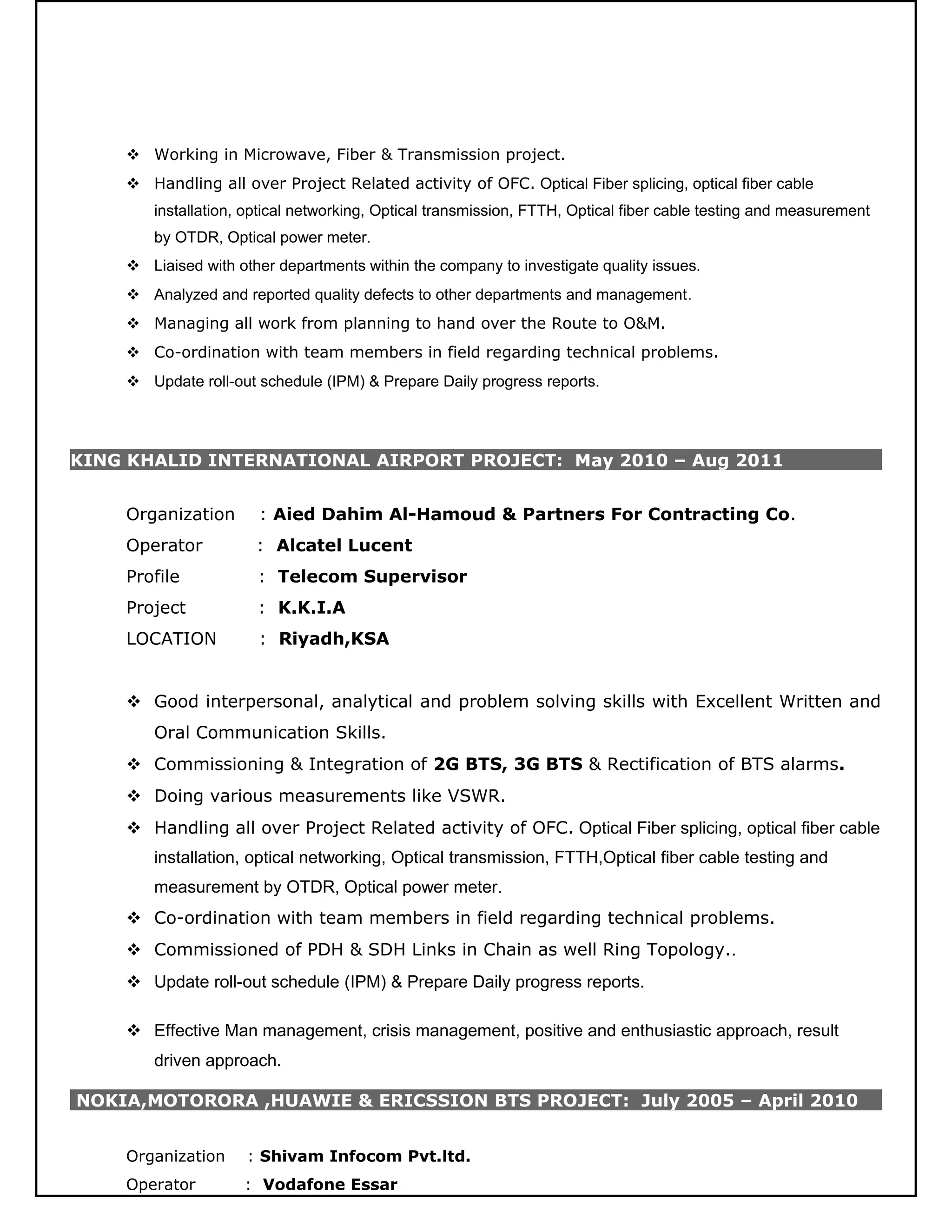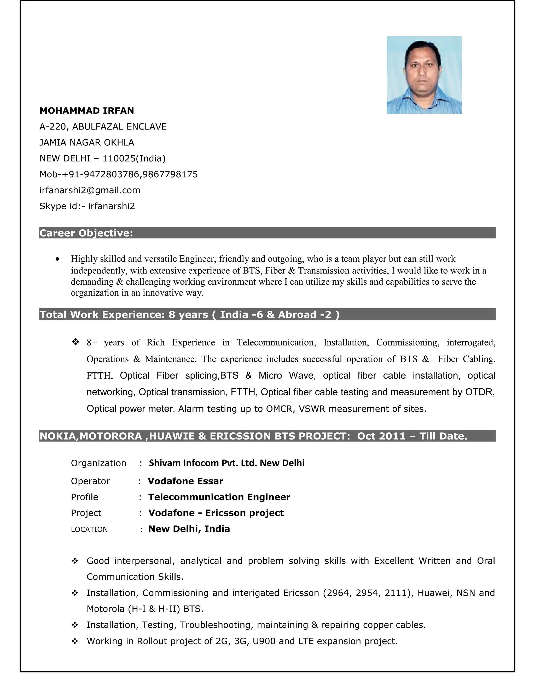 Mohammad Irfan is an experienced telecommunications engineer seeking a challenging position utilizing his 8 years of experience in BTS installation, fiber cabling, transmission, and maintenance. He has worked extensively with Nokia, Motorola, Huawei, and Ericsson equipment on projects in India and Saudi Arabia. Irfan has strong technical skills in optical fiber splicing, testing, transmission, and wireless networking. He is proficient in both written and spoken English, Hindi, Urdu, and Arabic.
