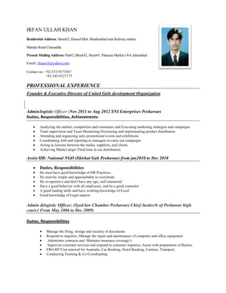 Irfan Ullah Khan has over 10 years of experience in administration, logistics, and human resources roles for various organizations in Pakistan. He is currently the Founder and Executive Director of the United Girls Development Organization and serves as the District Focal Person for Y PEER Pakistan in Charsadda. Khan holds a Bachelor's degree in Business Administration from the University of Peshawar and is pursuing an M.Phil. in Management Science from SZABIST Islamabad.
