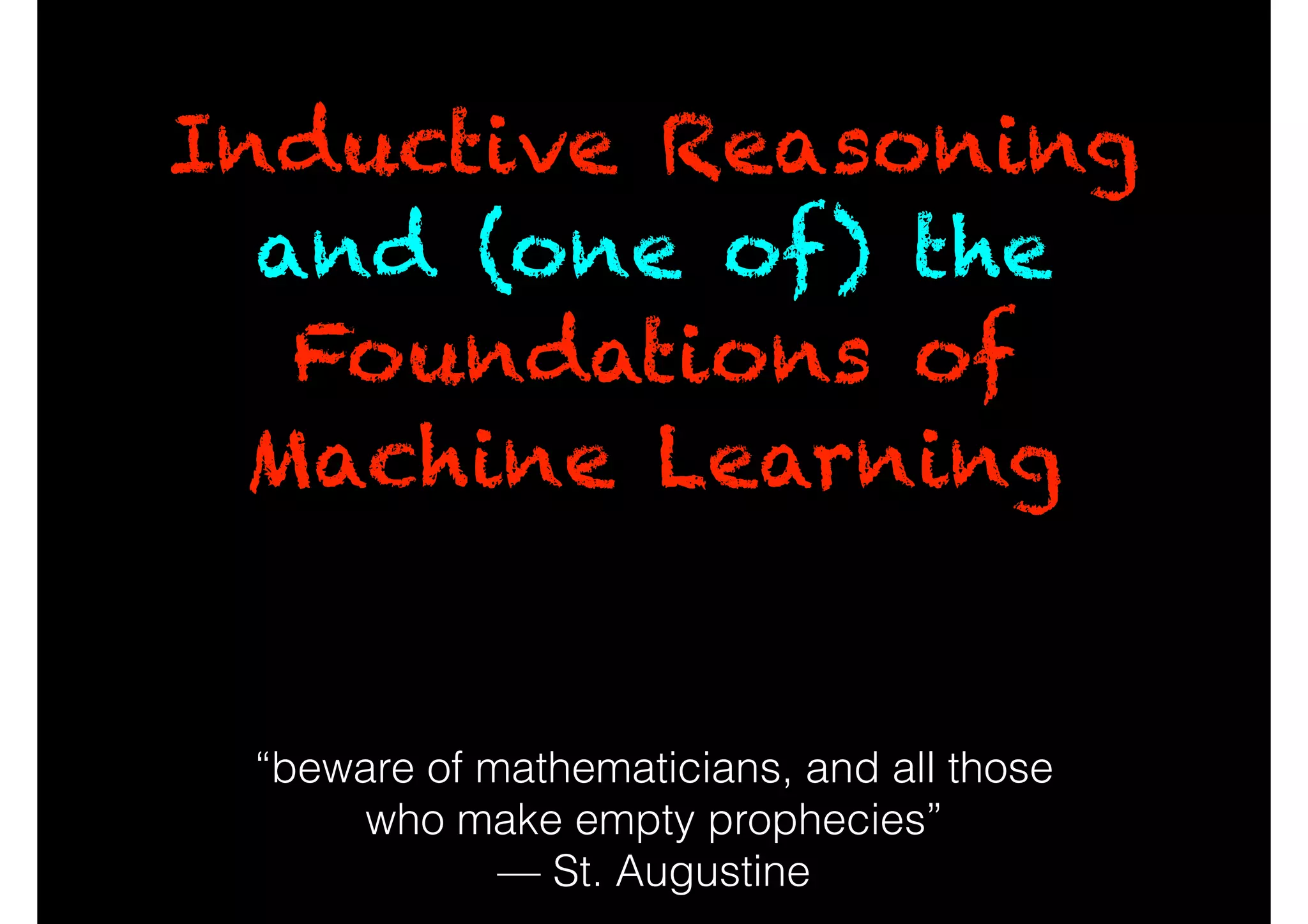 The document discusses the principles of inductive reasoning and various machine learning algorithms, exploring how algorithms learn from mistakes rather than relying solely on deductive reasoning. It outlines scenarios for sequential and adversarial prediction, emphasizing the importance of minimizing regret and the challenges posed by non-convex optimization in deep learning. The document concludes by highlighting the advancements in deep learning and mentions influential figures in the field.