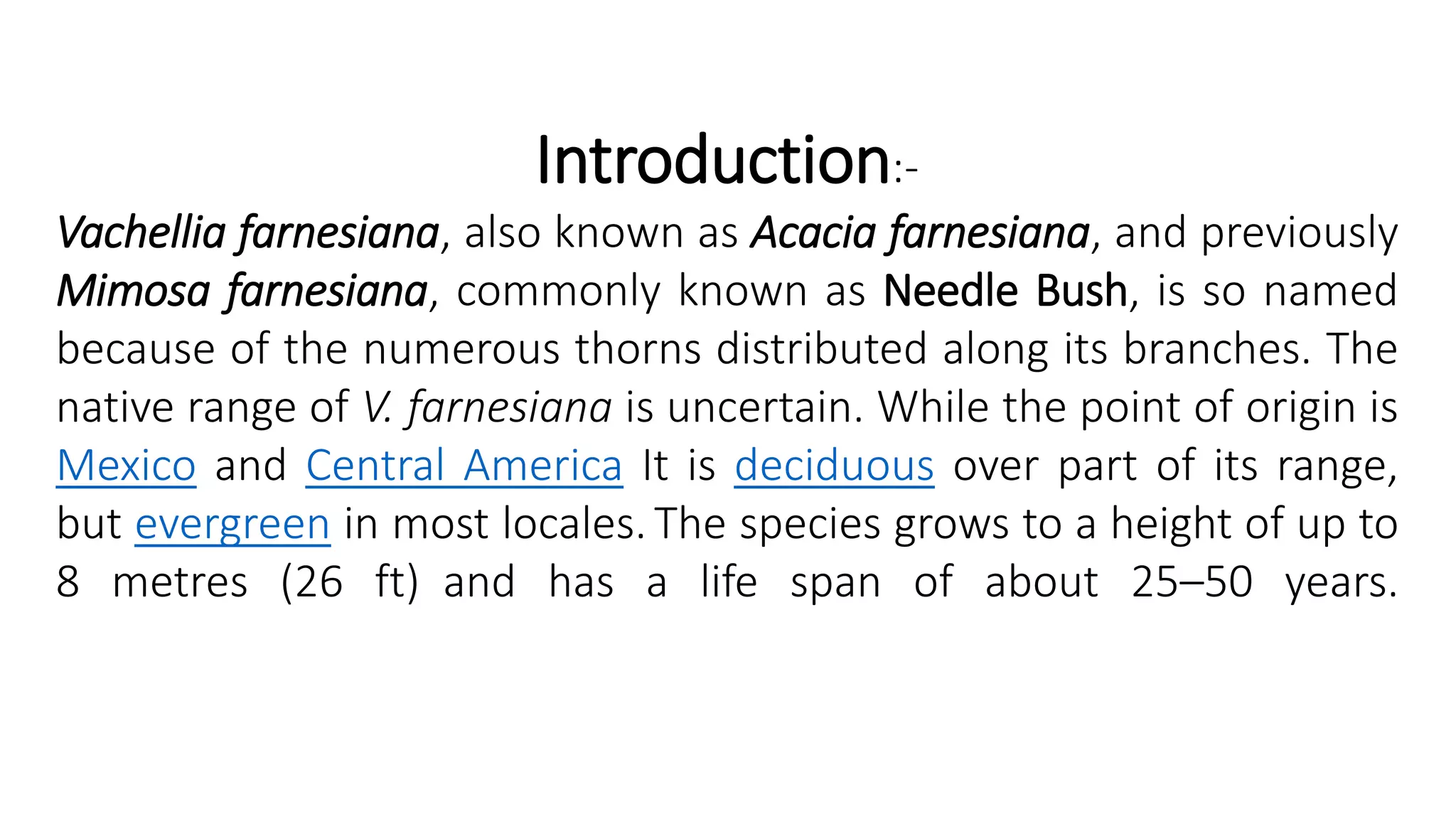 Vachellia farnesiana, commonly known as Needle Bush, is a woody shrub native to Mexico and Central America. It grows up to 8 meters tall and has a lifespan of 25-50 years. The shrub has numerous thorns and bipinnate leaves with many leaflets. It produces fragrant orange flowers and green seed pods. Various parts of the plant have traditional medicinal uses. The bark contains tannins and is used to treat hemorrhage. The flowers are distilled to produce a perfume. The seeds and foliage are used as a food source. V. farnesiana has spread widely due to human activity and is considered invasive in some regions.