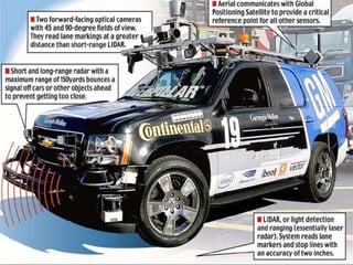 The document discusses driverless car technologies, including how cars can detect traffic lights using light sensors, systems that allow for fully autonomous control like ABS, cruise control, and lane departure warnings. It also covers automated parking and navigation using sensors and GPS. Driverless cars aim to minimize accidents by reducing human error, increasing safety and road capacity. While autonomous vehicles face challenges around network security and sensor failures, the technologies have potential to improve traffic flow and road safety.