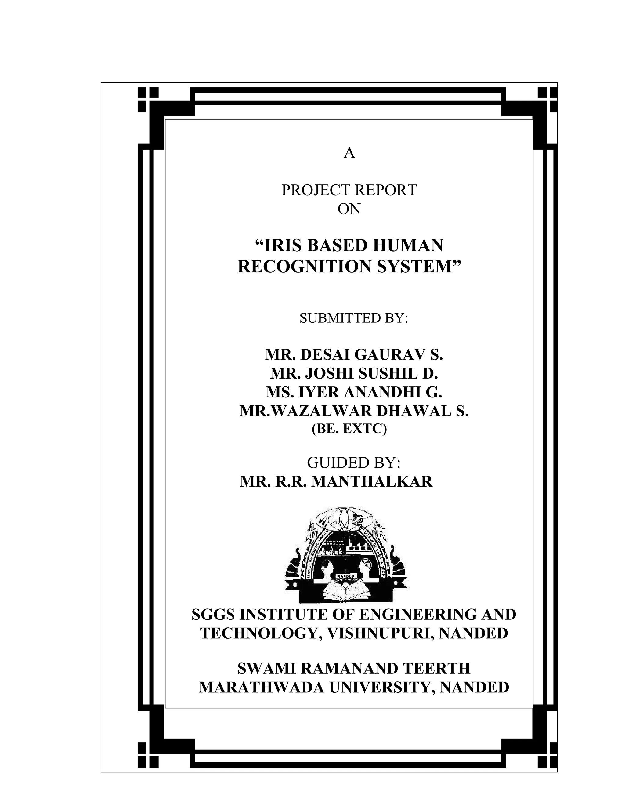 The project report details the development of an iris-based human recognition system, designed to accurately identify individuals using unique iris patterns as biometric parameters. The system involves several key processes including segmentation, normalization, feature extraction, and matching, utilizing the CASIA database for testing and validation. Overall, it aims to enhance security and reliability in identification systems amidst increasing concerns regarding privacy and authentication.