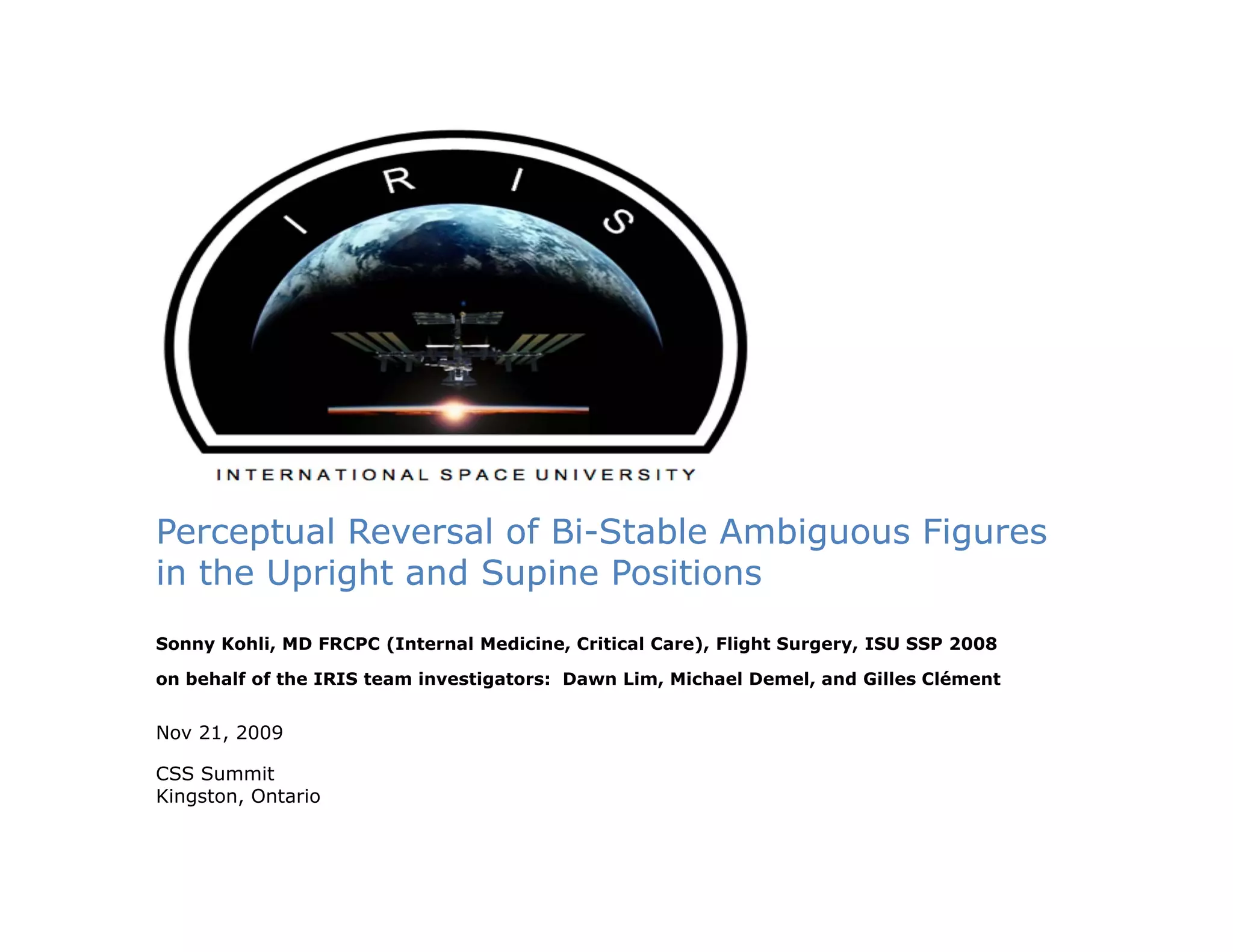 The document presents a study investigating the perceptual reversal of bi-stable ambiguous figures in different gravitational environments, specifically upright and supine positions. The research, conducted by a team including professionals from various institutions, aimed to determine how gravity influences the perception of these figures through a series of trials with volunteers. Results indicated that subjects experienced fewer perceptual shifts when supine, highlighting the central nervous system's reliance on gravitational cues for interpreting 3D information.