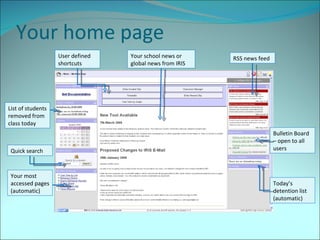 This document provides an overview of the features and functionality of an online student behavior recording and analysis system. It allows teachers to log student concerns and rewards, view reports on individual students or groups, and analyze behavior trends over time. Key features include logging incidents and selecting descriptors, viewing class and student summaries, running searches and filters, and generating detention schedules, lists, and notifications. Parents and students can also access the system to view behavior histories. The system aims to provide a centralized way for schools to track, analyze, and respond to student behavior.