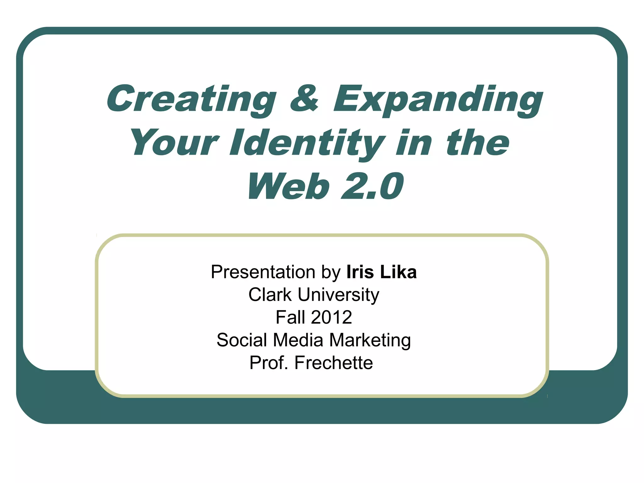 This presentation discusses how to create and expand one's online identity through a personal website and social media. It recommends starting with free website platforms and connecting the site to social networks like Twitter, Facebook, and YouTube. The presentation provides tips for determining a website's purpose and audience, researching competition, gathering content, designing features and a site map, setting an update schedule and budget, and launching for successful promotion through social media.