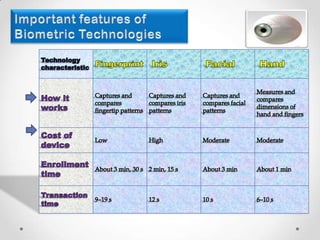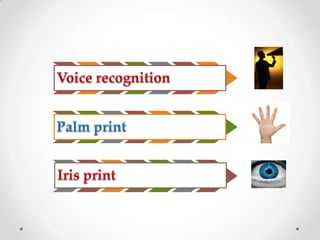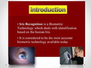 The document discusses iris recognition technology, which uses cameras to capture high-resolution photos of the iris and specialized software to encode the unique patterns in the iris. A key challenge is live-tissue verification to ensure an actual iris is being imaged rather than a photo or fake iris. Several methods are proposed to address this, such as changing lighting during imaging to verify the pupillary reflex, analyzing spatial frequencies to detect printer patterns, and observing natural eye movements. Iris recognition has been deployed in immigration systems in countries like the UAE and Canada.