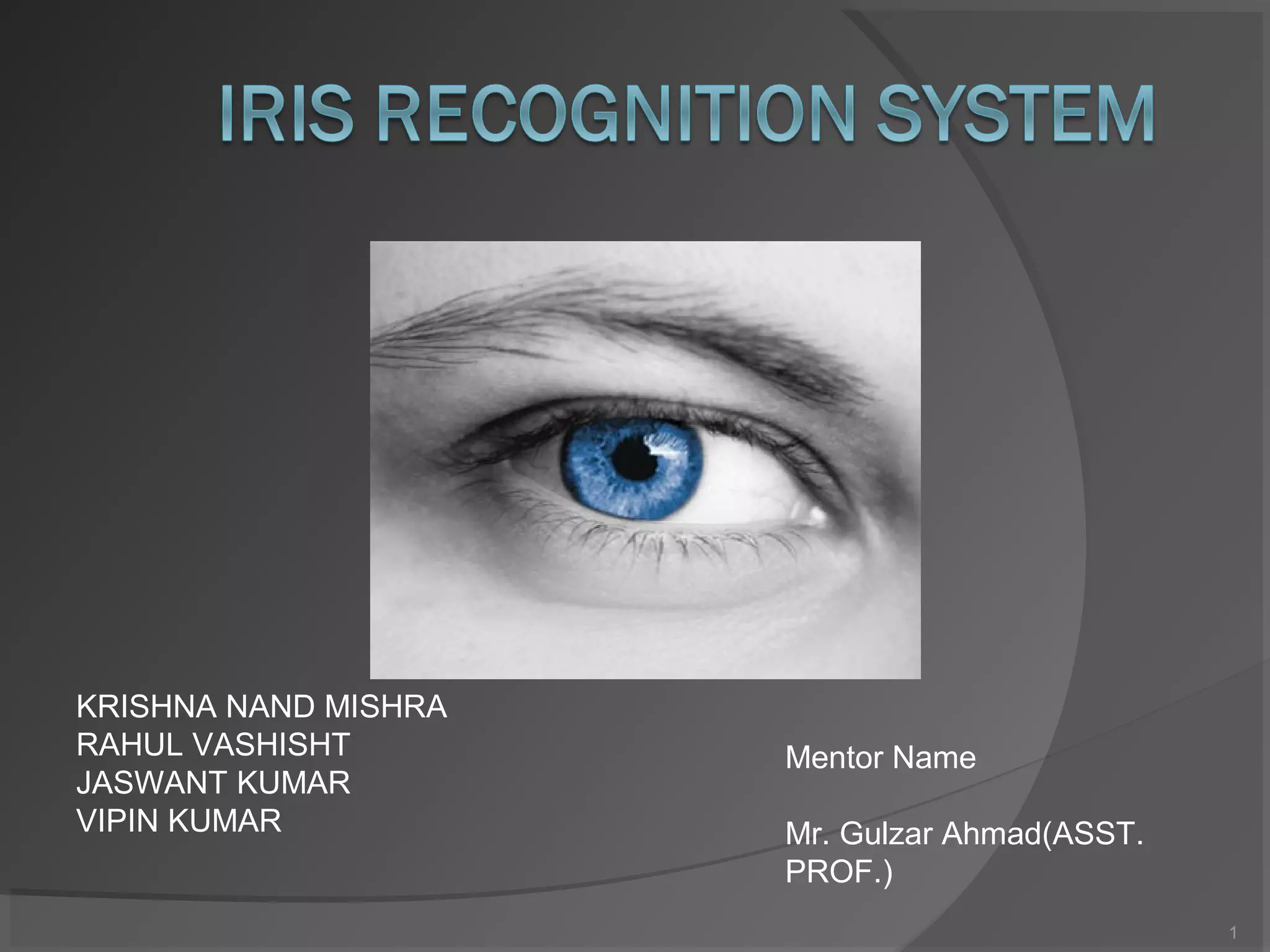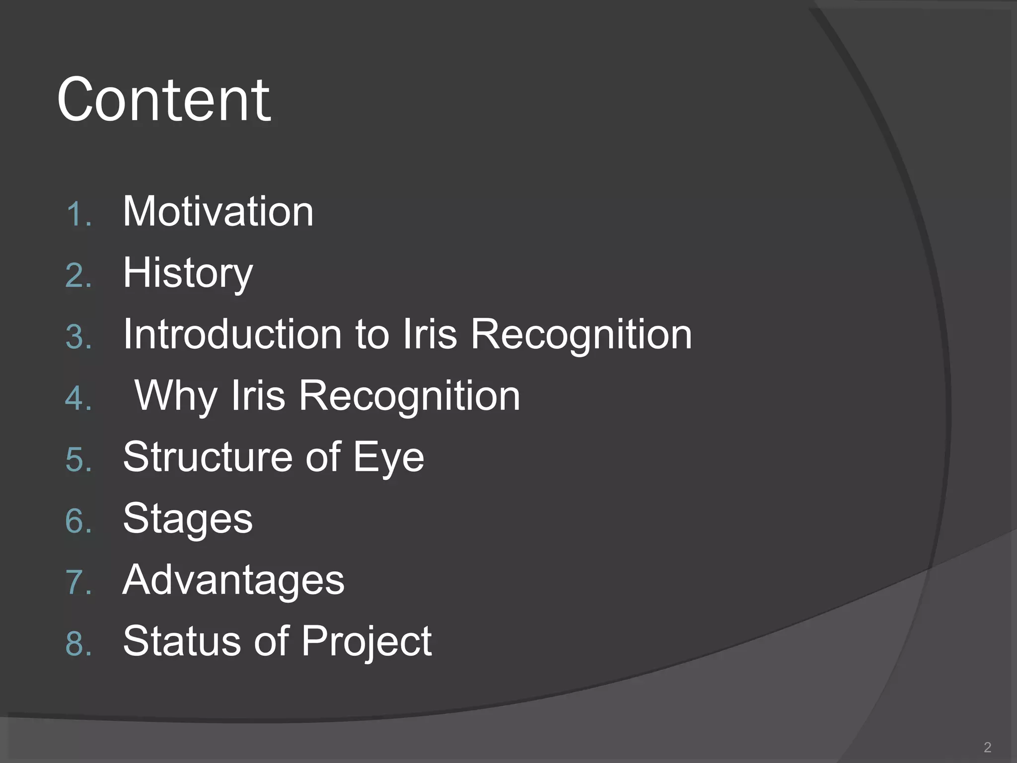 The document outlines the fundamentals and advantages of iris recognition technology, highlighting its uniqueness, stability, and non-invasive nature. Developed by pioneers including John Daugman, the technology involves several stages such as image acquisition, iris localization, normalization, feature extraction, and pattern matching. Currently, the project is in the iris localization phase using a dataset from the Chinese University of Hong Kong.