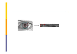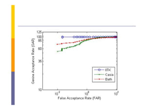 The document discusses iris biometrics and an iris recognition system. It provides details on iris anatomy, image acquisition, preprocessing, iris localization including pupil and iris detection, iris normalization, feature extraction using Haar wavelets, and matching. It evaluates the system on three databases achieving over 94% accuracy with low false acceptance and rejection rates. Further work is proposed on fusion, dual extraction approaches, indexing large databases, and using local descriptors.