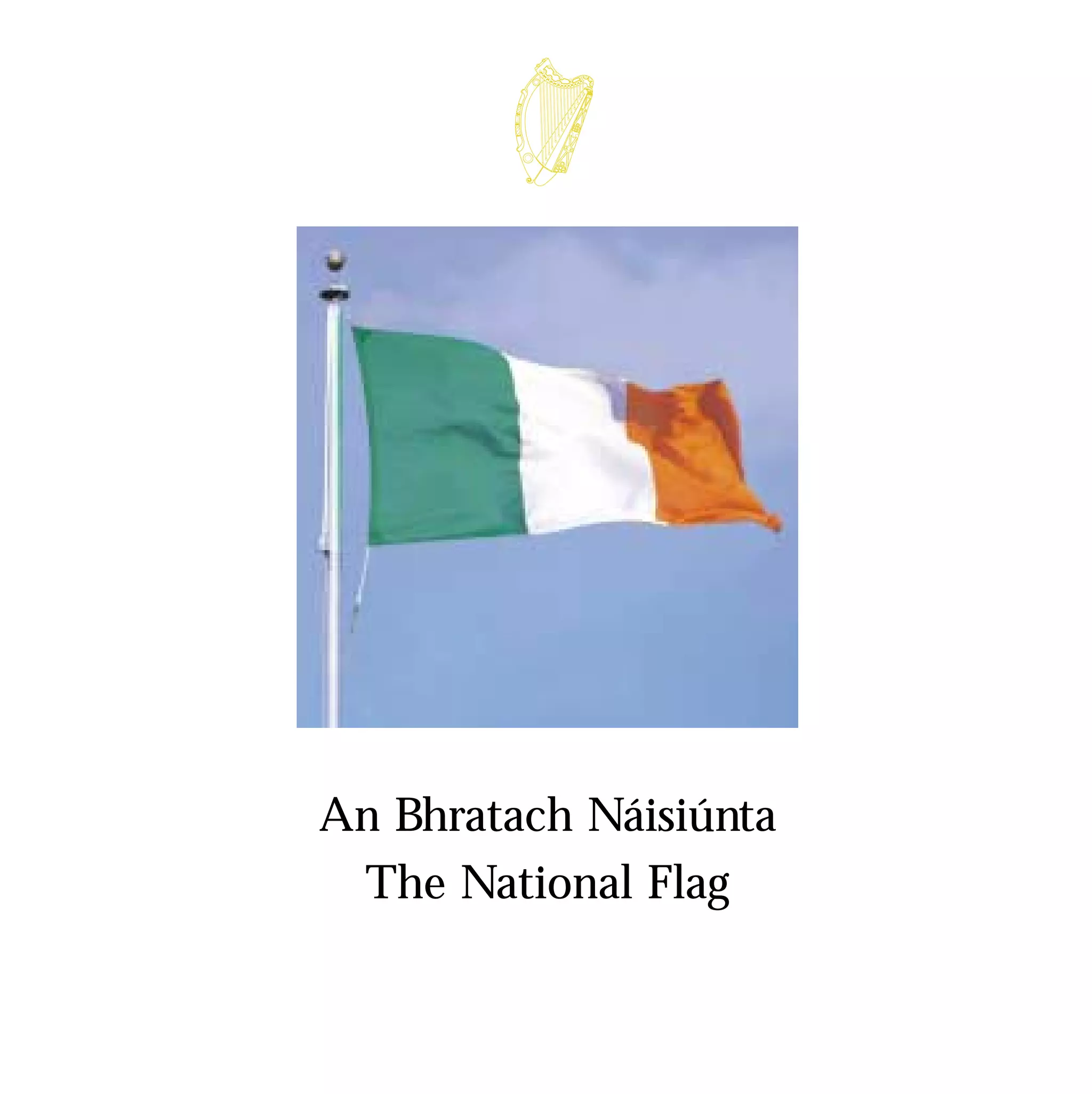 This document provides guidelines for the proper use and display of the Irish national flag. It begins with a brief history of the flag, noting that the modern tricolor flag of green, white and orange was officially adopted in 1937. The document then outlines guidelines for proper display, such as always placing the national flag in the position of honor when with other flags. It describes protocols for hoisting, lowering and saluting the flag. The document concludes by listing appropriate occasions for flying the national flag and contact information for further guidance.