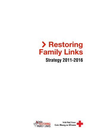 The Irish Red Cross Restoring Family Links Strategy 2011-2016 provides a framework to guide the development of RFL activities over the next five years. It identifies 17 strategic actions to improve services including regionalizing RFL, training volunteers, collaborating with other organizations, and raising awareness of RFL services. The strategy aims to reflect best practices, efficiently meet individual needs with compassion, and ensure the IRC plays its role in the Movement's RFL network and with statutory authorities in Ireland. An implementation plan will be developed in 2011 and evaluations will assess progress in 2013 and 2015.