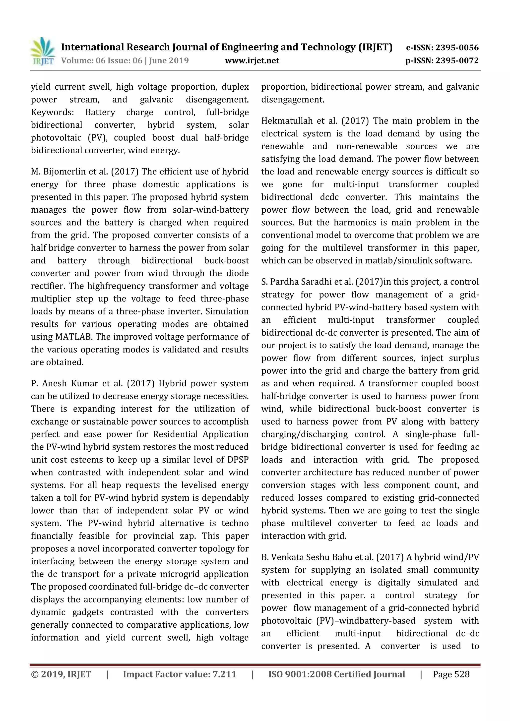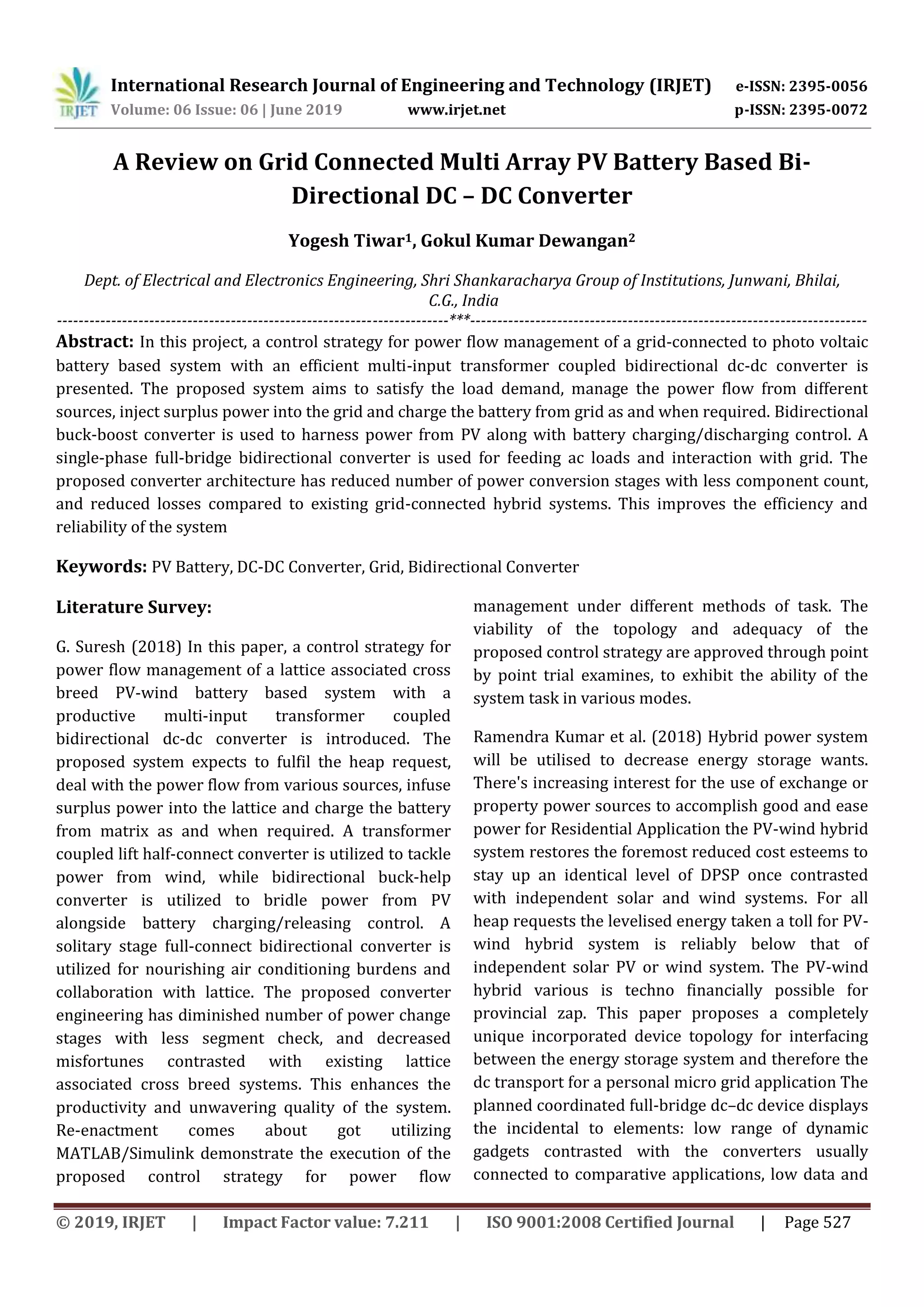 This document summarizes a research paper on a grid-connected photovoltaic (PV) battery system with a bidirectional DC-DC converter. The proposed system aims to satisfy load demand, manage power flow from PV, battery, and grid sources, inject excess power to the grid, and charge the battery from the grid. A bidirectional buck-boost converter is used to harness power from PV and control battery charging/discharging. A single-phase full-bridge bidirectional converter feeds AC loads and interacts with the grid. The proposed converter architecture has fewer conversion stages and components than existing hybrid systems, improving efficiency and reliability.