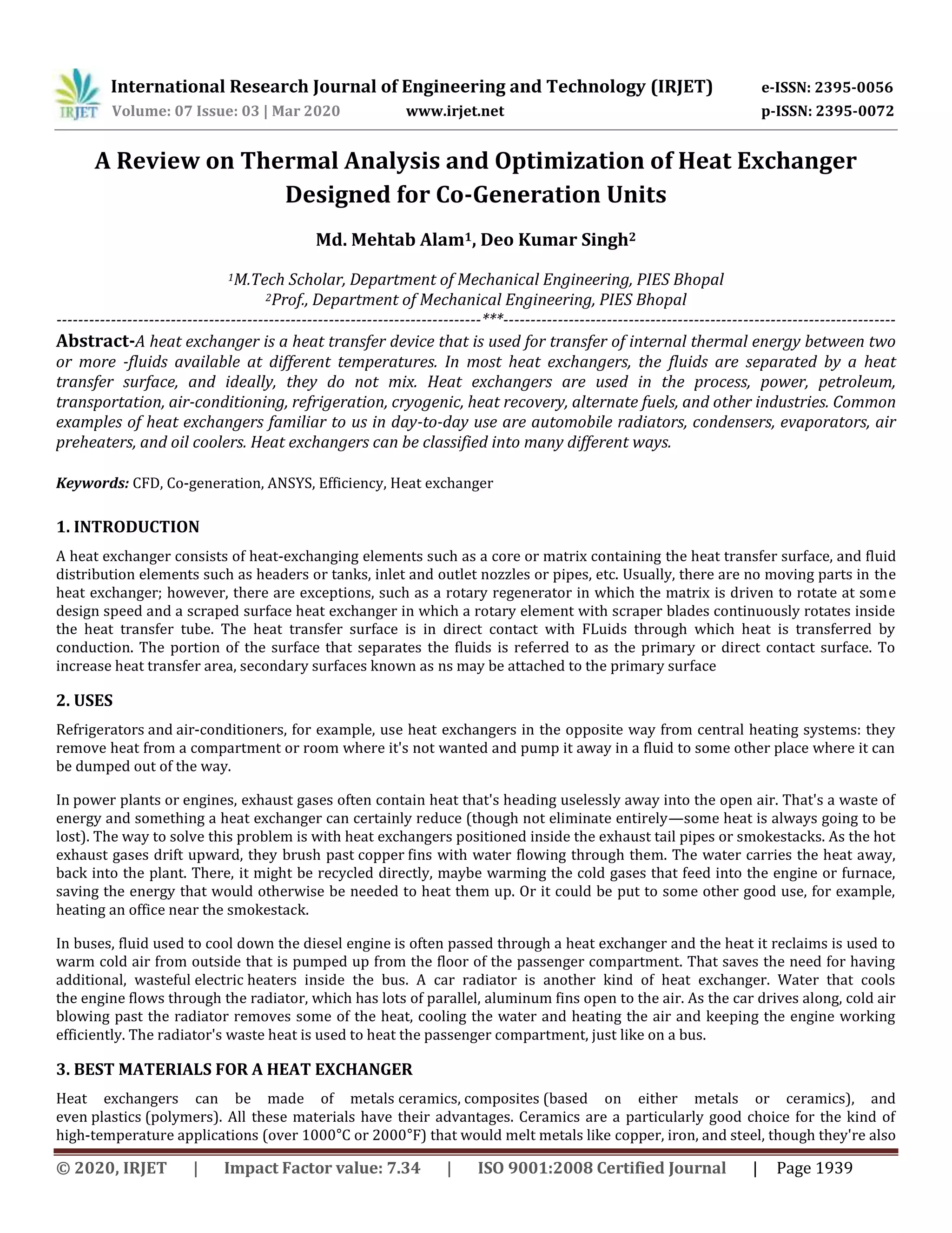 This document discusses heat exchangers and their optimization for co-generation units. It begins with an abstract discussing heat exchangers and their uses. It then discusses key factors that influence heat exchanger efficiency such as temperature differential, flow rate, and installation configuration. Common heat exchanger materials are also discussed. The document then focuses on co-generation and discusses past studies on optimizing heat exchangers for co-generation units through variables like number of tubes, tube diameter, and inlet velocity. The present work aims to obtain the best heat exchanger design for co-generation units by comparing efficiency under different parameters.