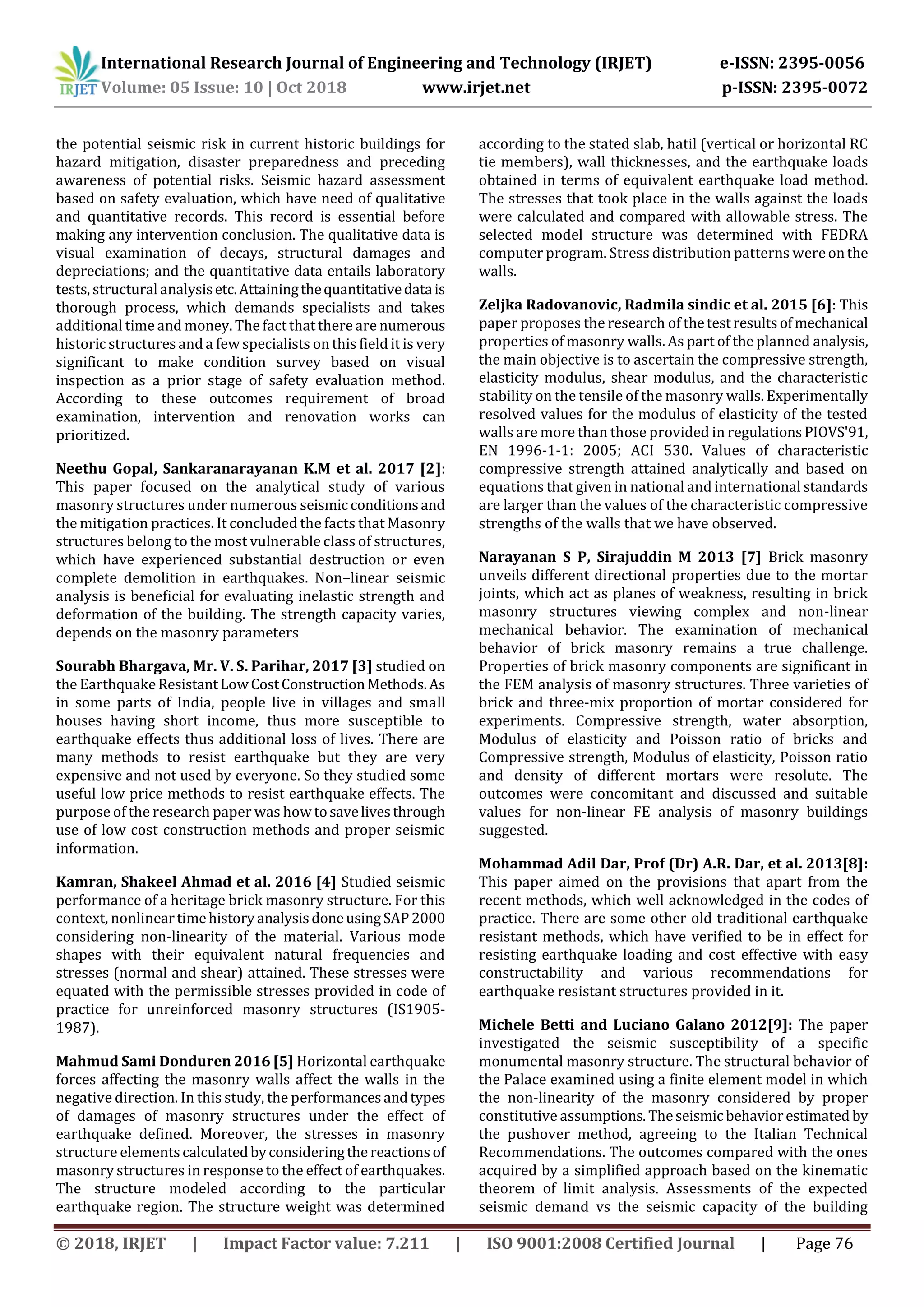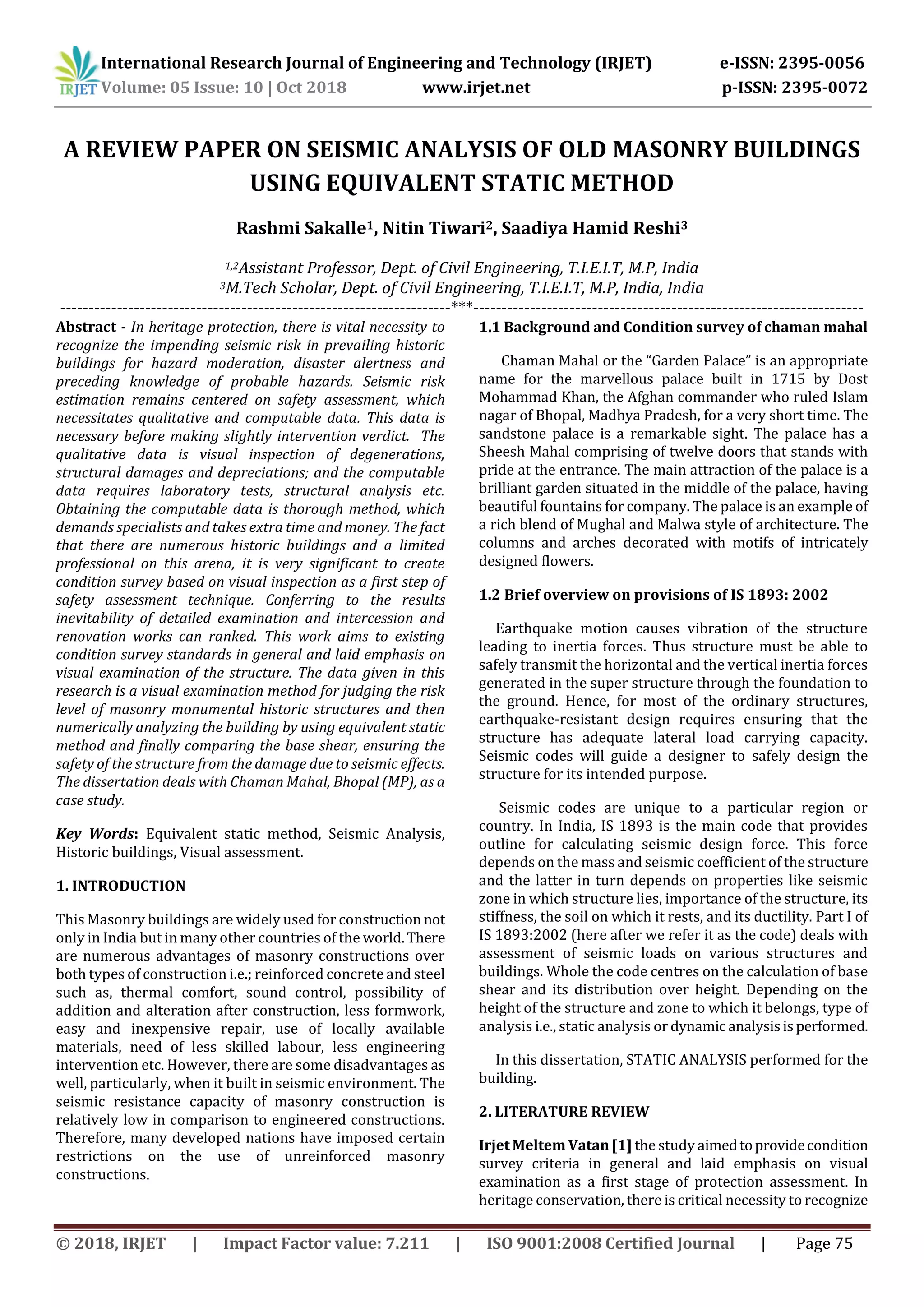 This document provides a literature review on seismic analysis of old masonry buildings using the equivalent static method. It summarizes 15 previous research papers on topics like visual assessment methods for masonry structures, analytical studies of masonry structures under seismic conditions, low-cost earthquake resistant construction methods, seismic performance analysis of heritage masonry buildings, experimental determination of mechanical properties of masonry walls, and homogenization techniques for masonry building analysis. The document aims to provide background research for analyzing the seismic performance of an old masonry palace in Bhopal, India called Chaman Mahal using the equivalent static method outlined in the Indian code IS 1893:2002.