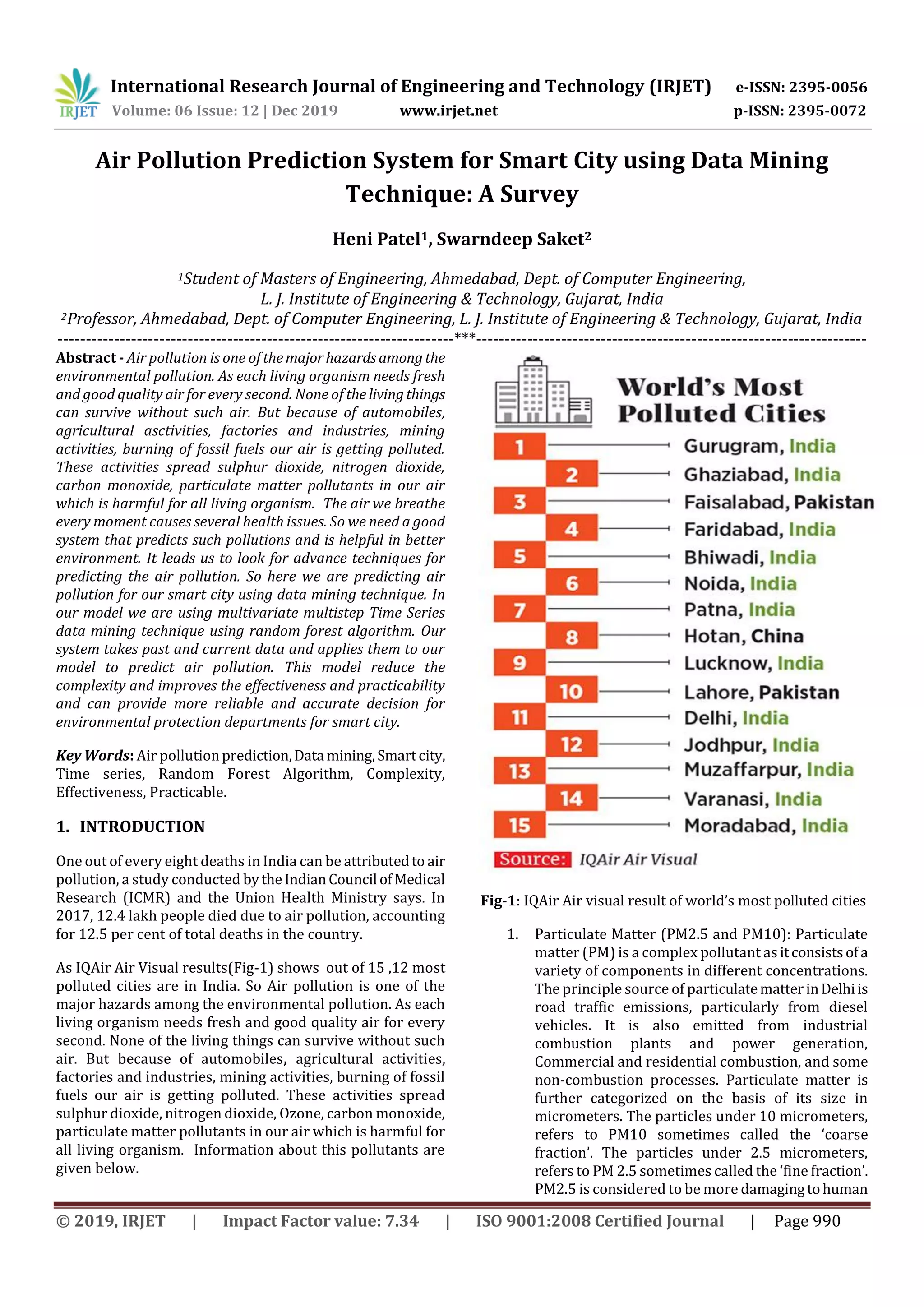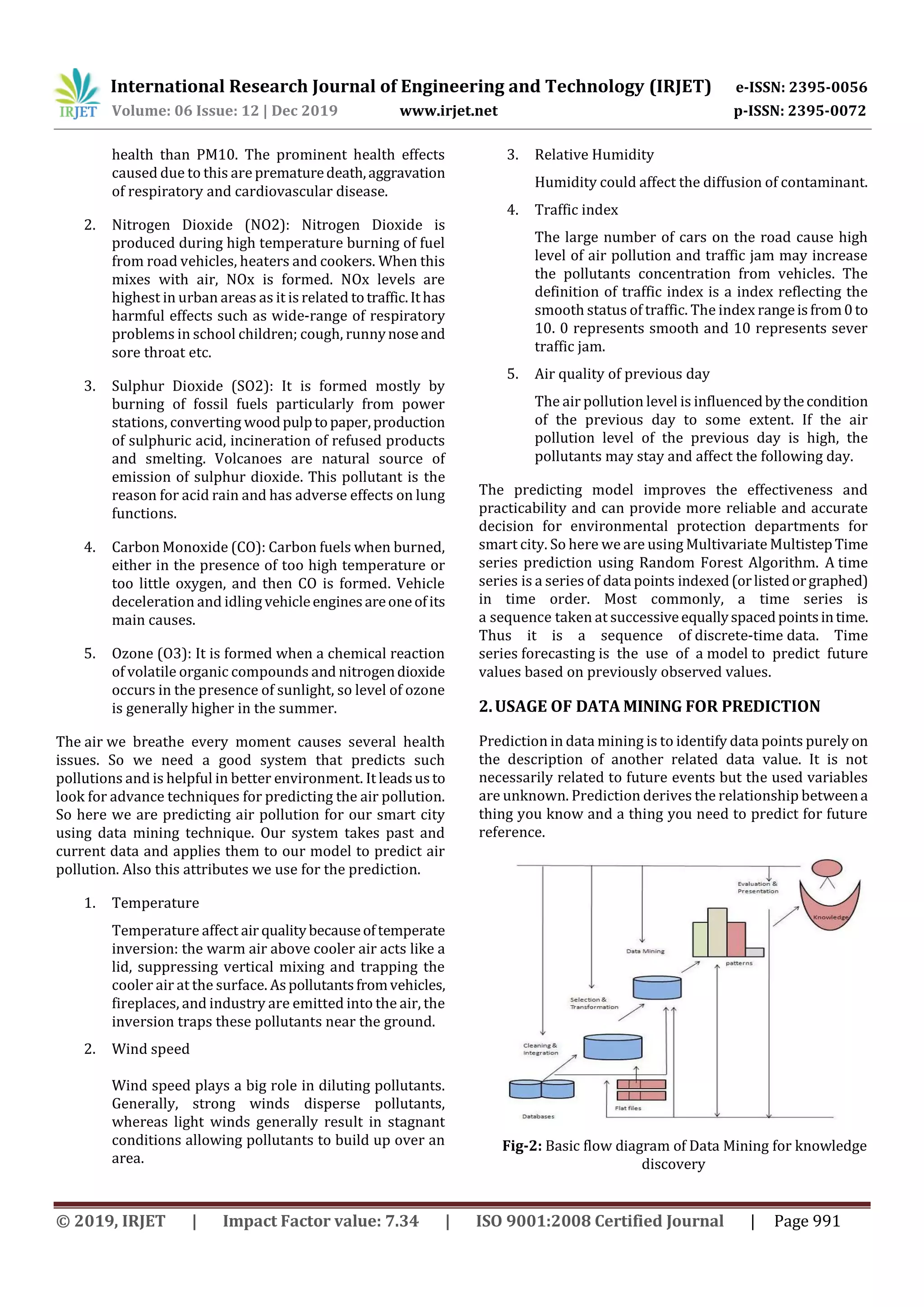 This document discusses using data mining techniques to predict air pollution levels in a smart city. It begins with background on the health impacts of various air pollutants like particulate matter, nitrogen dioxide, sulfur dioxide, and carbon monoxide. It then describes using a multivariate, multistep time series approach with a random forest algorithm to predict future air pollution levels based on past and current pollution data as well as other attributes like temperature, wind speed, humidity, traffic levels, and the previous day's air quality. Finally, it reviews several related works that used techniques like neural networks, linear regression, extreme learning learning, and decision trees to predict pollution trends in other cities and compares their limitations and accuracies.