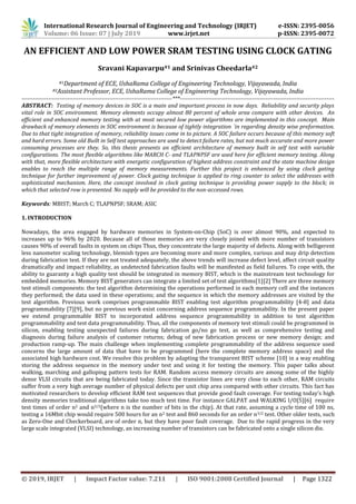 This document discusses efficient testing of SRAM using clock gating techniques. It begins with an introduction about how memory elements occupy most of the chip area in modern SOCs and outlines reliability issues with tightly integrated memory. It then describes March C and TLAPNPSF algorithms that are used for efficient memory testing. The document proposes using clock gating applied to a ring counter to selectively power memory rows during testing, reducing power consumption. It provides details on delay buffers used for temporary data storage and describes the implementation of a ring counter using D flip-flops to sequentially select memory addresses.