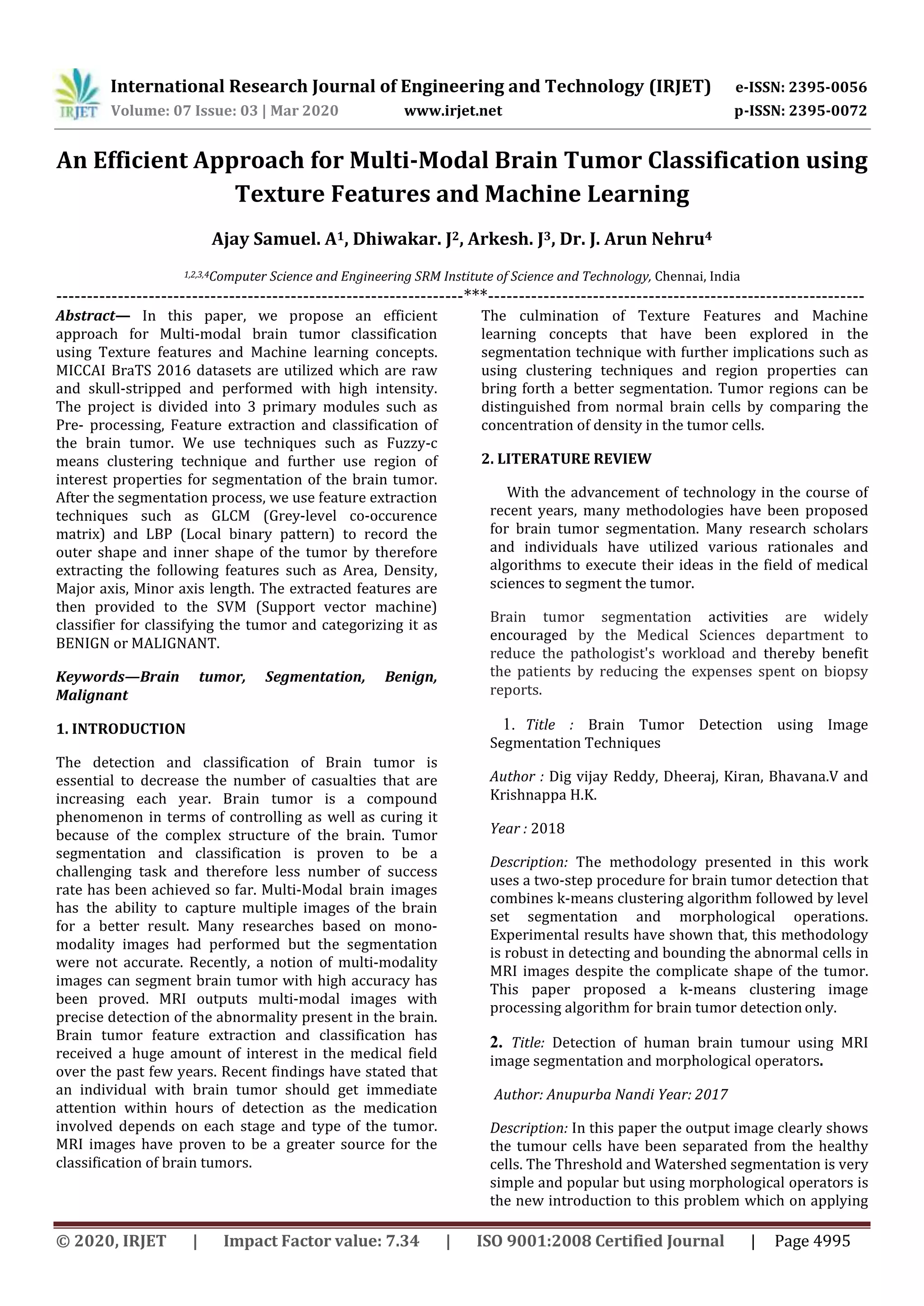 This paper proposes an efficient approach for multi-modal brain tumor classification using texture features and machine learning. It uses the MICCAI BraTS 2016 dataset and segments tumors using fuzzy c-means clustering. It then extracts texture features like GLCM and LBP and classifies tumors as benign or malignant using an SVM classifier. The proposed method achieved accurate segmentation and classification of brain tumors in MRI images.