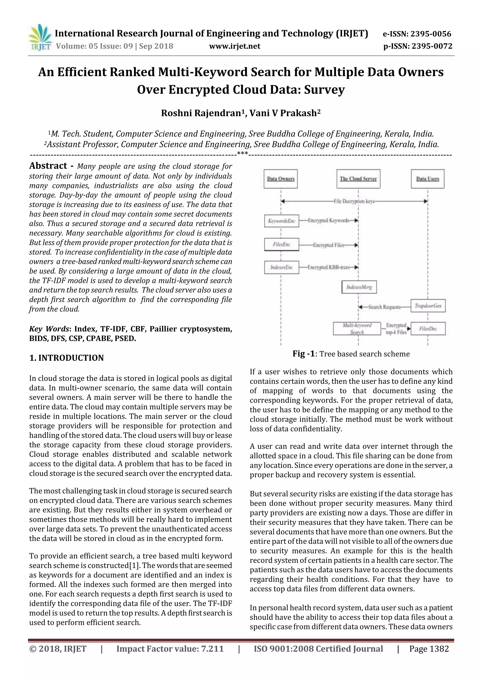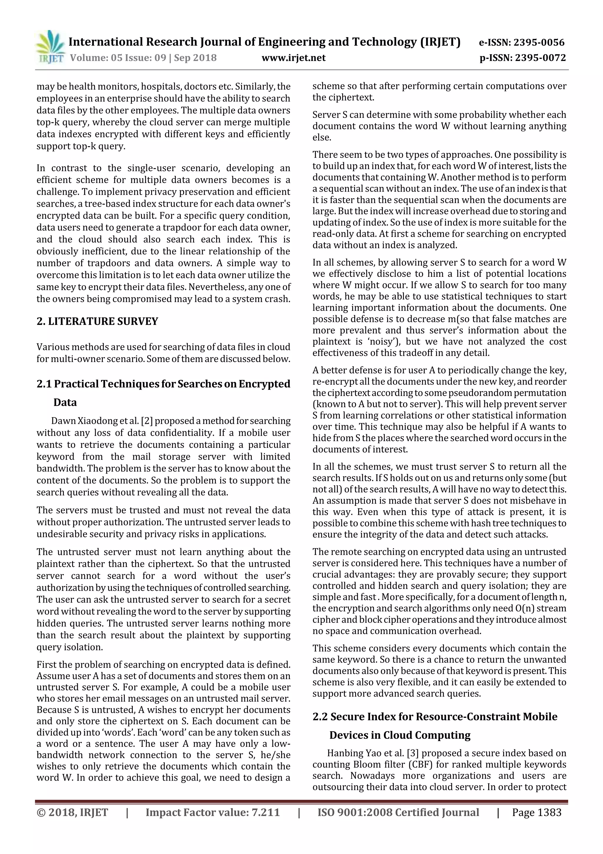 This document summarizes and reviews several existing techniques for efficient multi-keyword search over encrypted cloud data from multiple data owners. It discusses methods that build tree-based indexes, use the TF-IDF model to rank results, and employ techniques like counting Bloom filters and the Paillier cryptosystem to enable searches while preserving data privacy. It also reviews schemes for attribute-based encryption to allow hierarchical access to encrypted files in cloud storage.