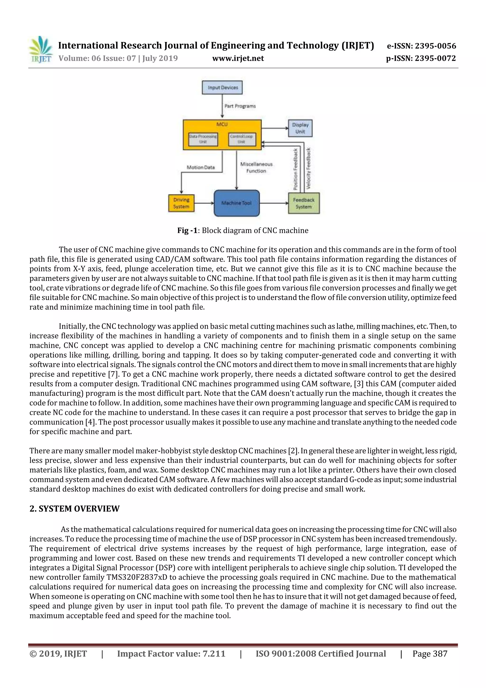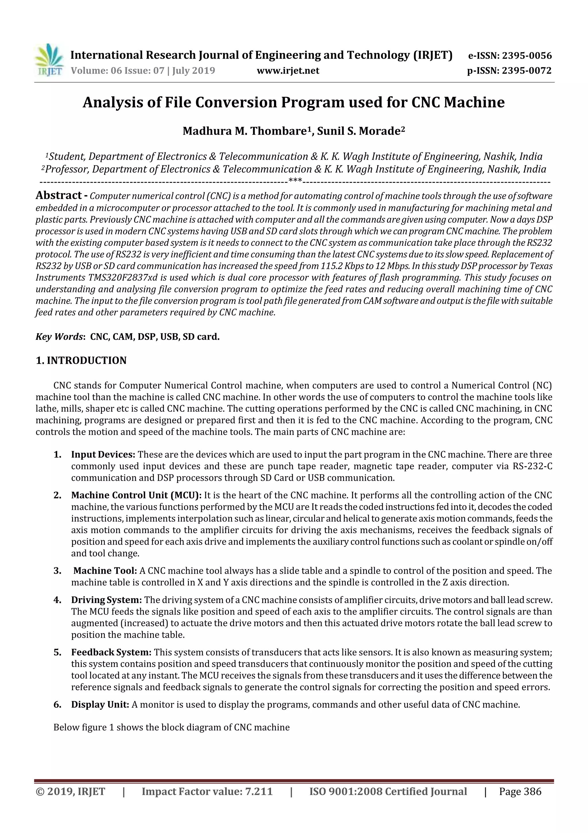 This document describes a file conversion program used to optimize feed rates and reduce machining time for CNC machines. The program takes as input a tool path file generated from CAM software. It then calculates acceptable feed rates and other parameters required by the CNC machine. The output is a .kou file with the optimized parameters. The program aims to minimize machining time by avoiding having the cutting tool slow down to zero speed when changing directions or feed rates, and instead allows it to slow to an intermediate speed. This reduces unnecessary acceleration and deceleration time. The file conversion process and goals of optimizing feed rates and machining time are discussed.