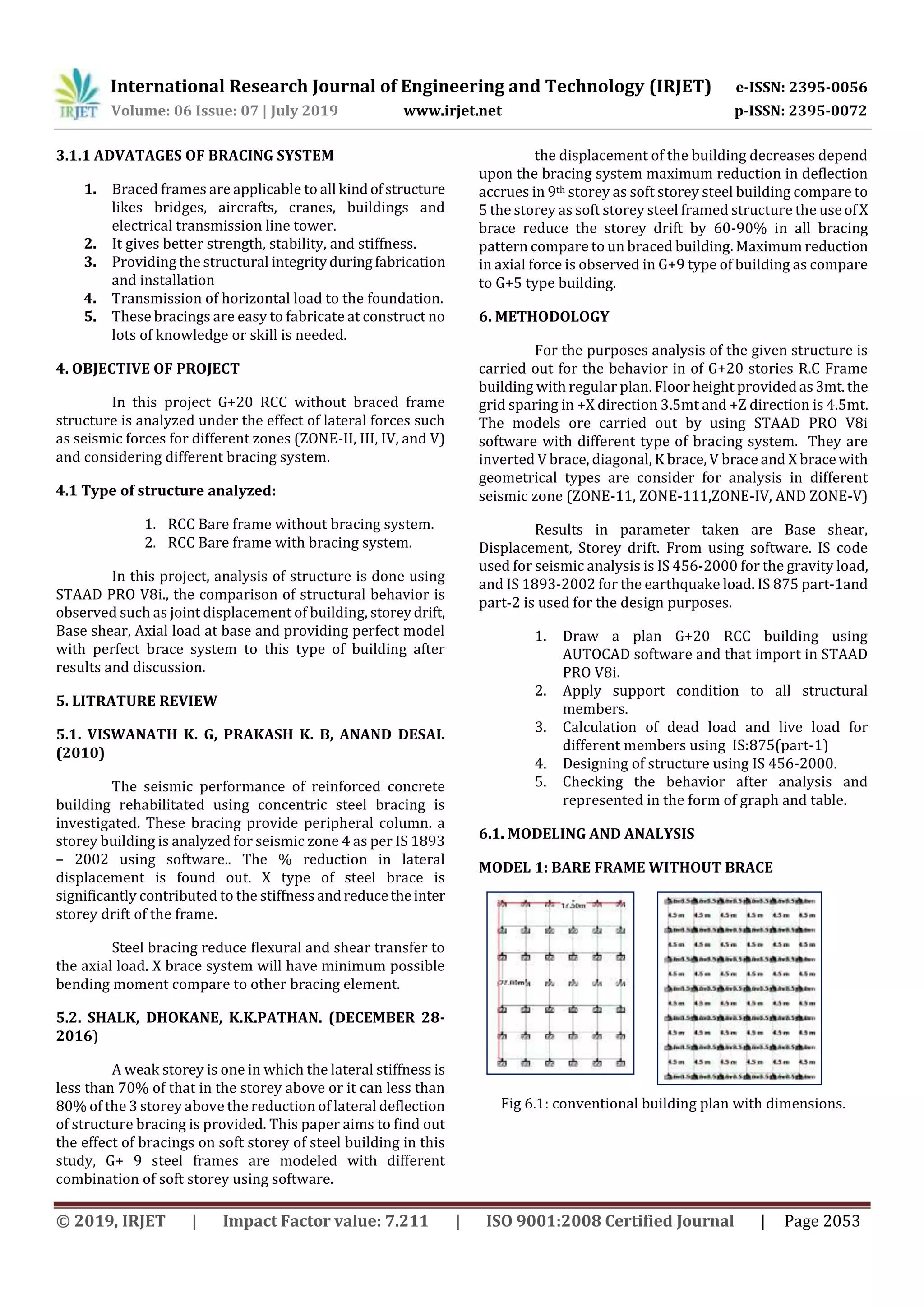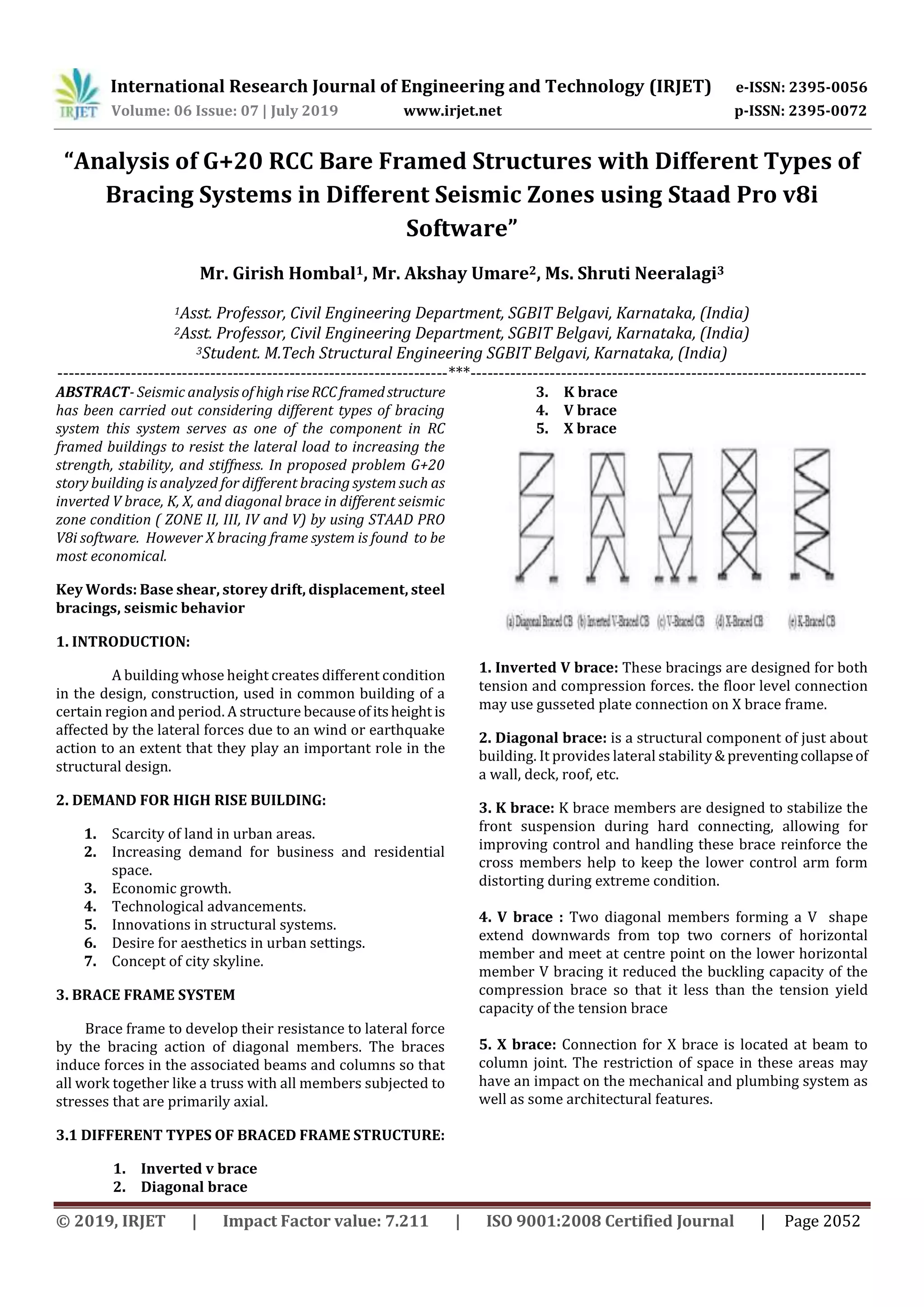 This document analyzes a G+20 reinforced concrete framed structure with different bracing systems (inverted V, diagonal, K, X, and V braces) in different seismic zones (II, III, IV, and V) using STAAD Pro v8i software. The X bracing system performed best by reducing displacement by up to 75%, increasing base shear by up to 17.6%, and reducing story drift by up to 74.9% compared to the bare frame structure. While other bracing systems provided improvements, X bracing provided the most economic and effective performance overall.