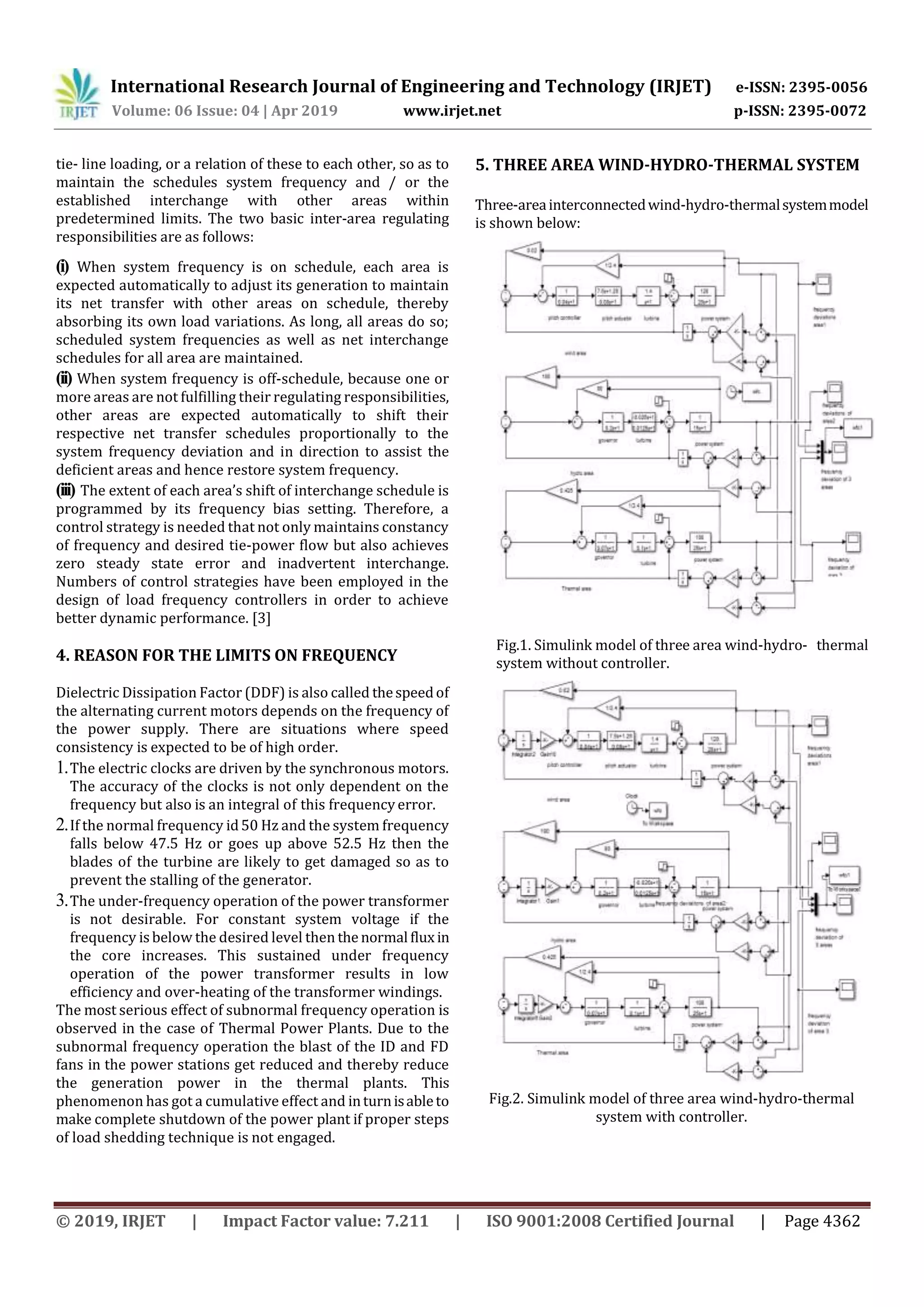 This document analyzes load frequency control for a distributed grid system involving wind, hydro, and thermal power plants using conventional and fuzzy logic controllers. It models a three-area system with area 1 containing a thermal plant, area 2 containing a hydro plant, and area 3 containing wind generation. It simulates the system responses to a 1% load disturbance in one area using each controller and compares the undershoot and settling time. The fuzzy logic controller provides better dynamic response with lower undershoot, overshoot, and faster settling time compared to the conventional PI controller. This shows fuzzy logic control is more effective at maintaining frequency stability in an interconnected power system with various generation sources.