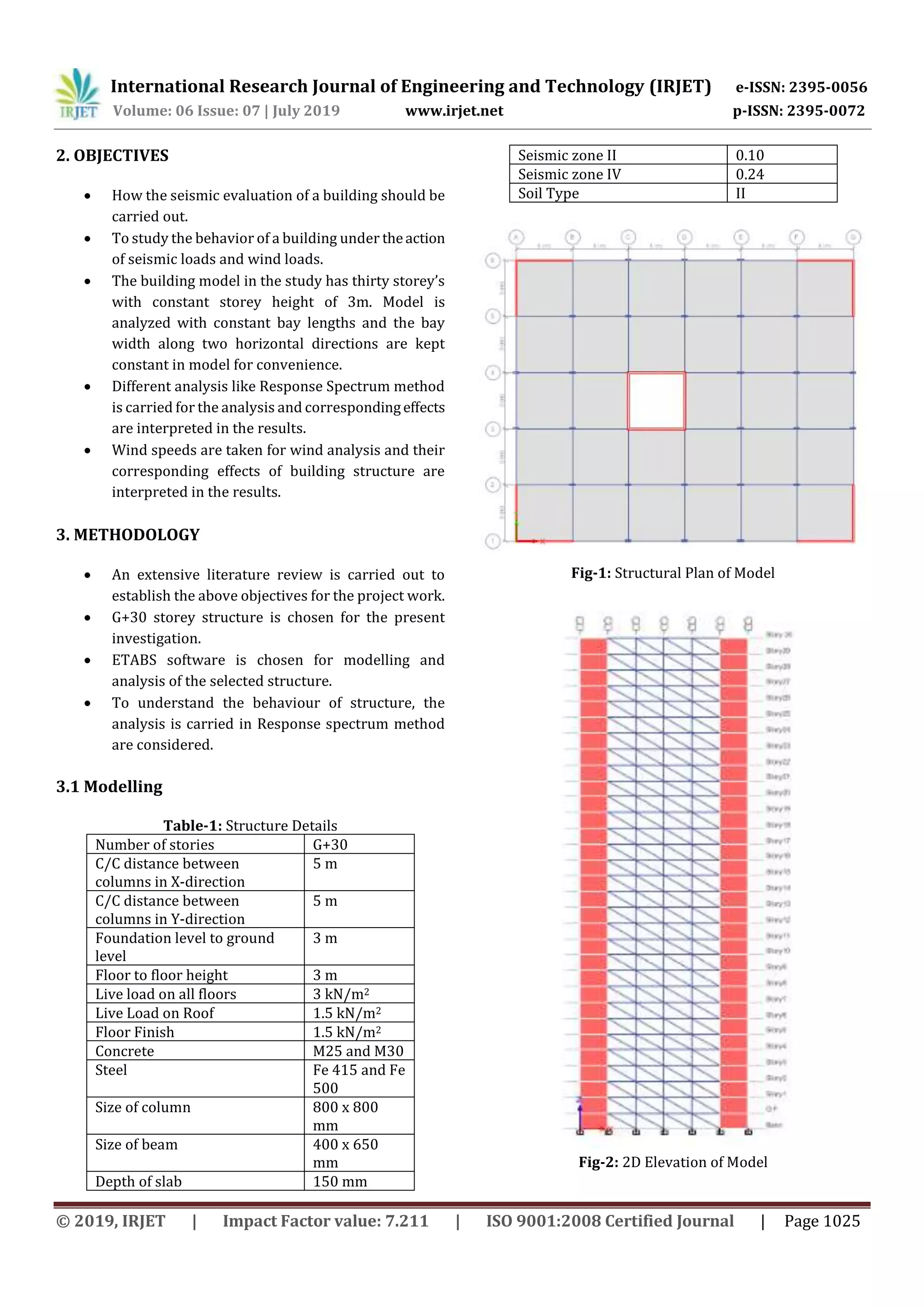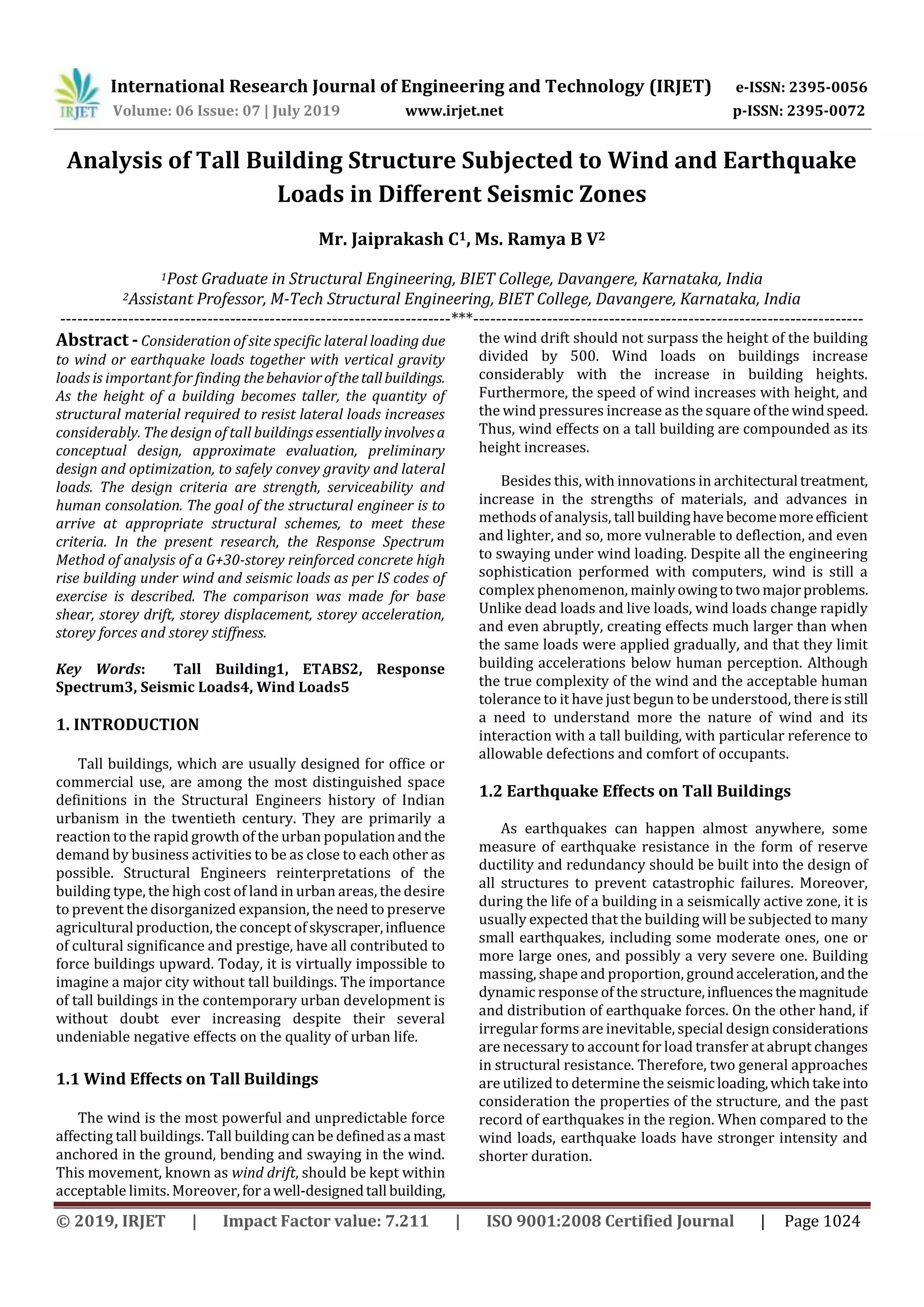This document analyzes the response of a 30-story reinforced concrete building to wind and earthquake loads in different seismic zones using ETABS software. It models a building with a constant floor height of 3m and analyzes it using the response spectrum method. The results show greater displacement, drift, acceleration, forces and stiffness at higher levels for both wind and seismic loads. Loads also increase in higher seismic zones. Shear walls and bracing are found to effectively increase seismic response by providing lateral stiffness and strength.