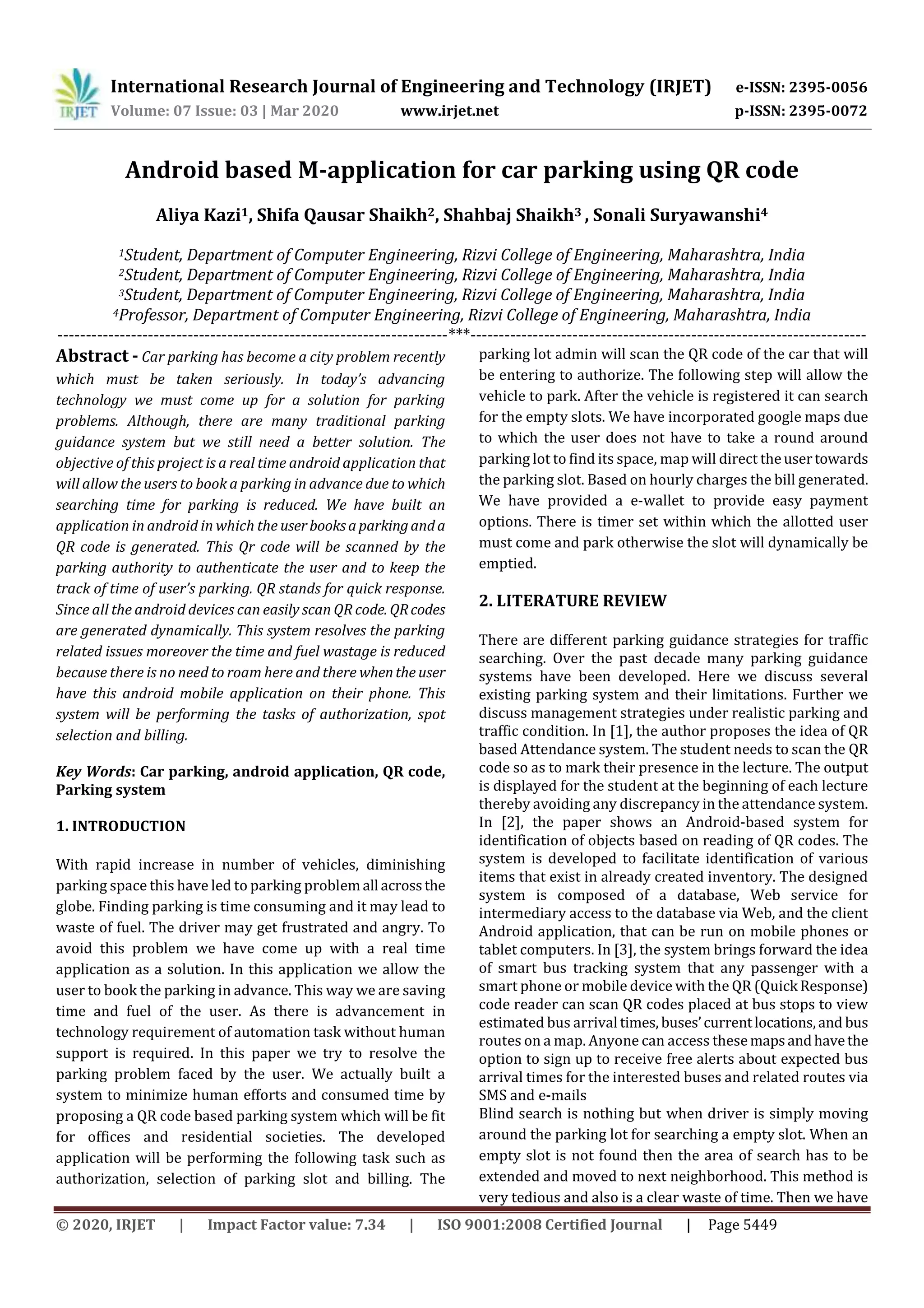 1) The document proposes an Android-based mobile application that uses QR codes to help users book and pay for parking in advance, reducing search times. 2) The application allows users to reserve a parking spot, generates a unique QR code for them, and provides a map to guide them directly to their spot. Parking authorities can then scan the QR code to authenticate the user. 3) The system is intended to resolve parking issues by minimizing human effort and time spent searching for spots through advance booking and QR code authentication, while also reducing fuel consumption and traffic.