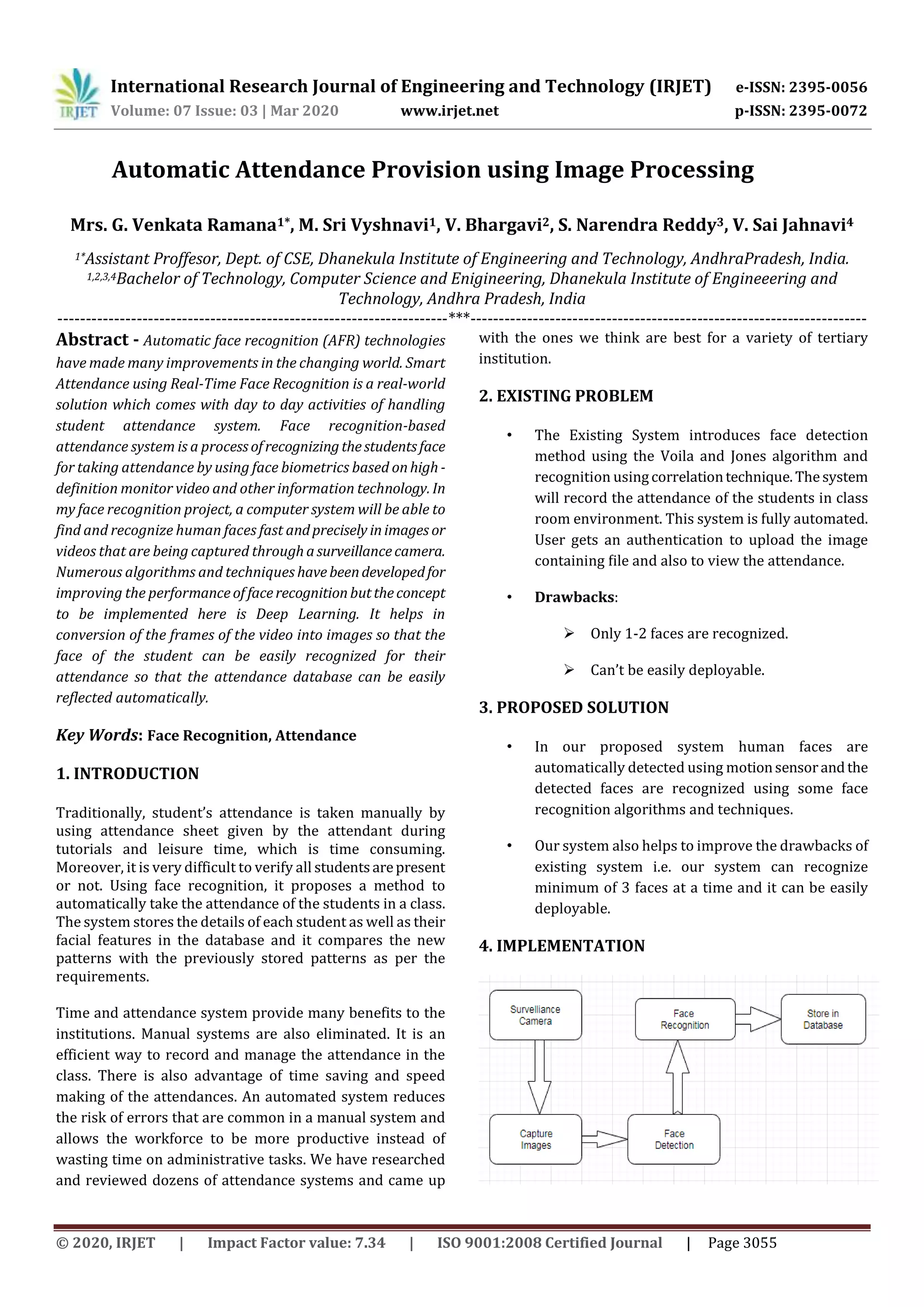 The document proposes an automatic attendance system using image processing and face recognition techniques to identify students faces from video frames in order to automatically record attendance. It discusses issues with current manual attendance systems and outlines a proposed solution using motion sensors and face recognition algorithms to identify a minimum of 3 faces at a time and allow for easy deployment of the system. The system would help save time over manual methods and reduce errors by automatically recognizing student faces and recording attendance data.