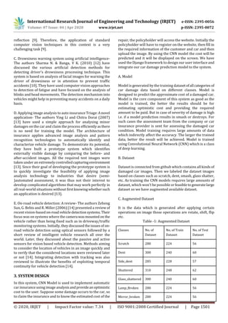 This document proposes an automatic car insurance system using image analysis. It discusses developing a convolutional neural network model to classify car damage types from images and estimate repair costs. The system would allow a policyholder to upload damage photos, get an estimated severity level and repair cost, and streamline the insurance claims process. The model is trained on a dataset of car damage images labeled with their class. It aims to accurately assess minor damage and provide cost estimates to give policyholders faster information after an accident. For major damage cases, further inspection by an insurance assessor would still be required.