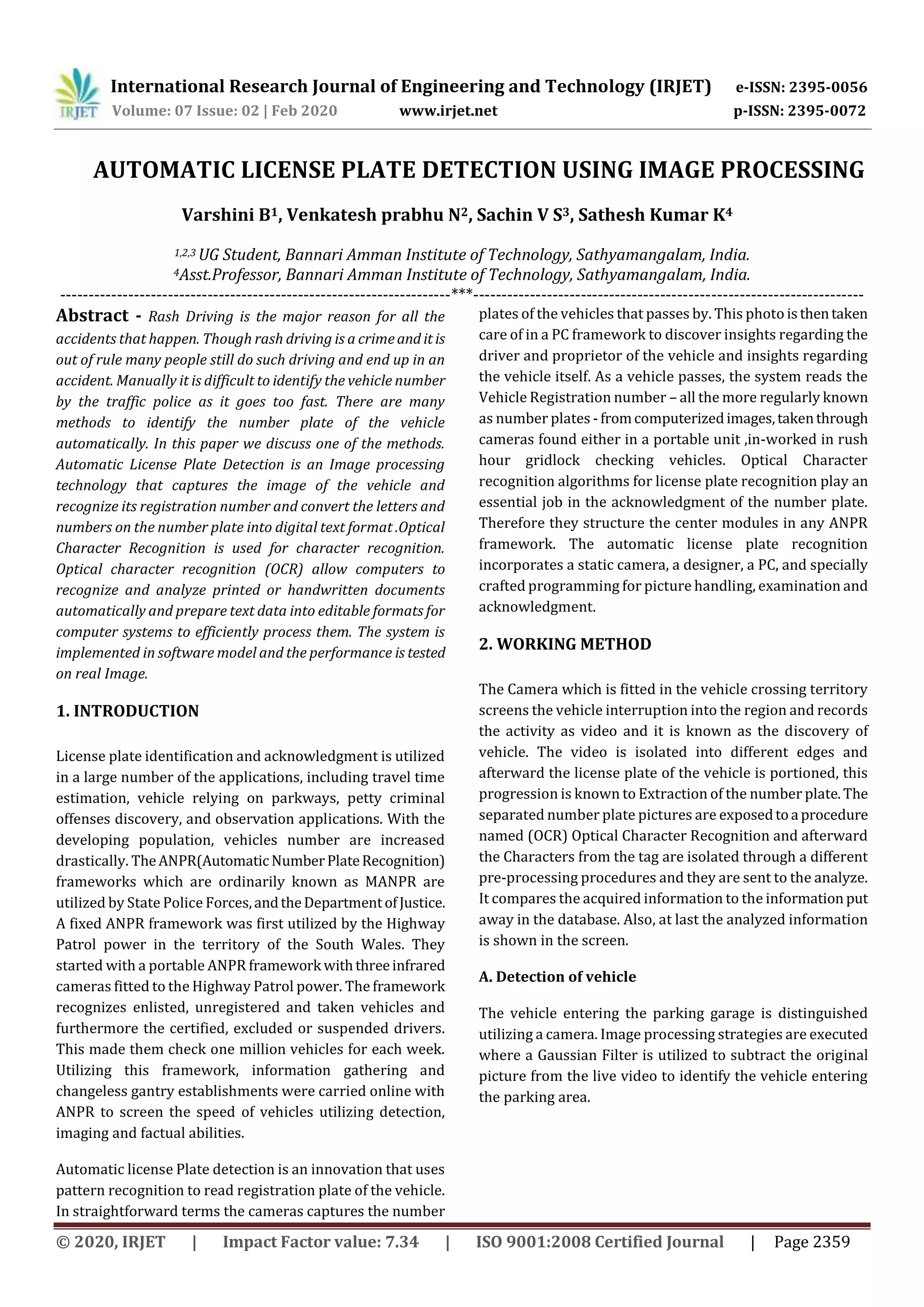 This document describes a system for automatic license plate detection using image processing. The system uses a camera to capture images of vehicles, extracts the license plate from each image using preprocessing techniques, recognizes the characters on the plate using optical character recognition (OCR), and matches the characters to a database to identify the vehicle. The key steps are detection of the vehicle, extraction of the license plate image, application of OCR techniques like template matching to recognize characters, and matching the results to a database to output the identification information. The system is designed to help identify vehicles automatically for applications like traffic monitoring and law enforcement.