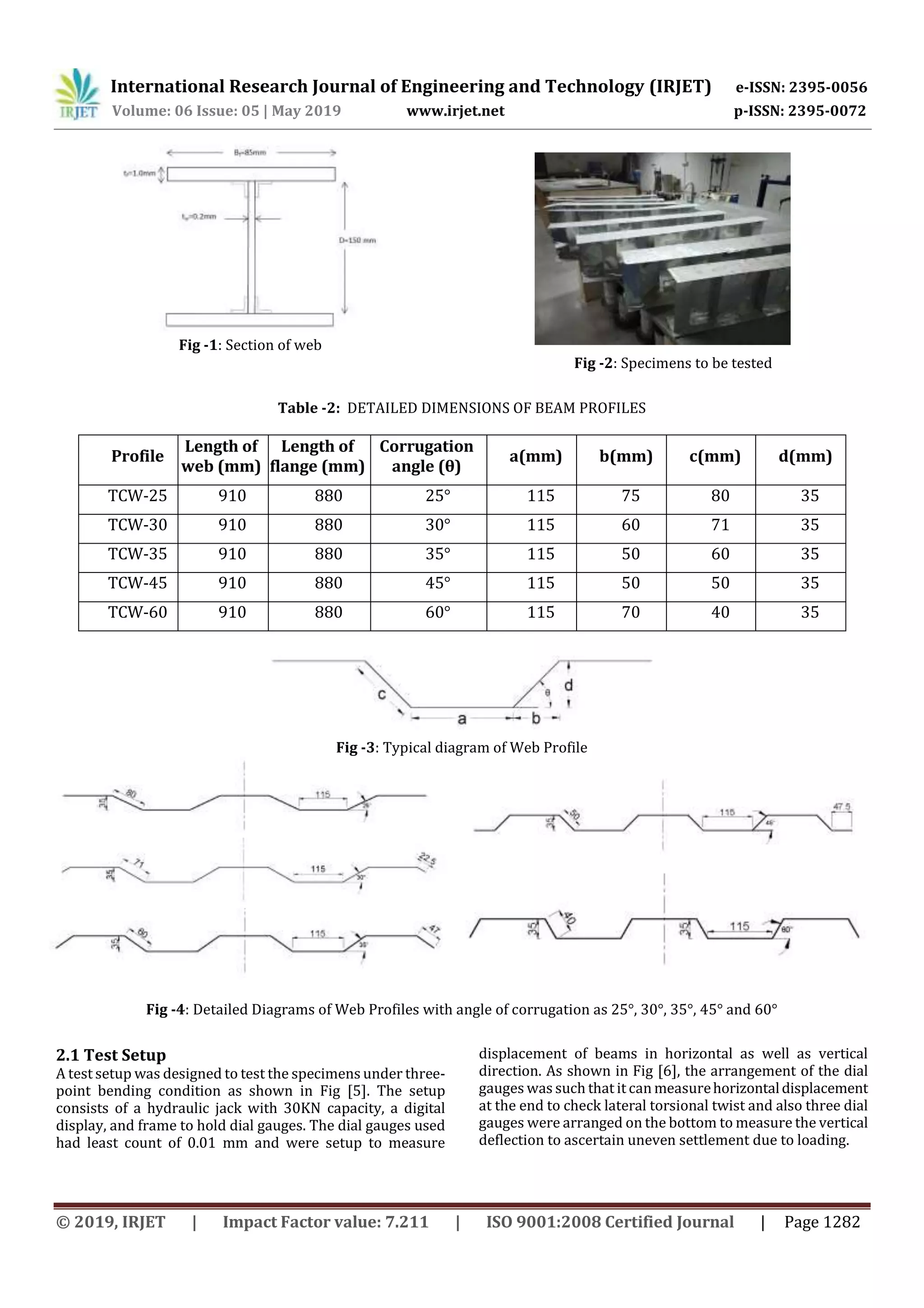 This document summarizes an experimental study that compared the behavior of steel beams with trapezoidal corrugated webs with different corrugation angles (25°, 30°, 35°, 45°, 60°) under point load conditions. Five steel beam specimens were fabricated and tested. The results showed that the beam with a 35° corrugation angle experienced 21-82% less central deflection and 31-104% less lateral displacement compared to the other beams, indicating it provided the optimal combination of strength and material efficiency. Therefore, a trapezoidal corrugated web with a 35° corrugation angle can result in improved structural behavior for steel beams.