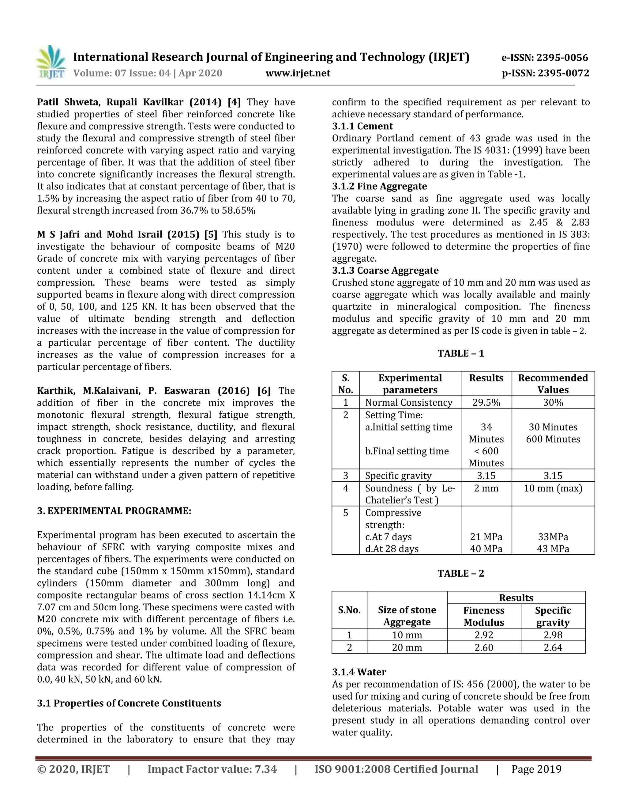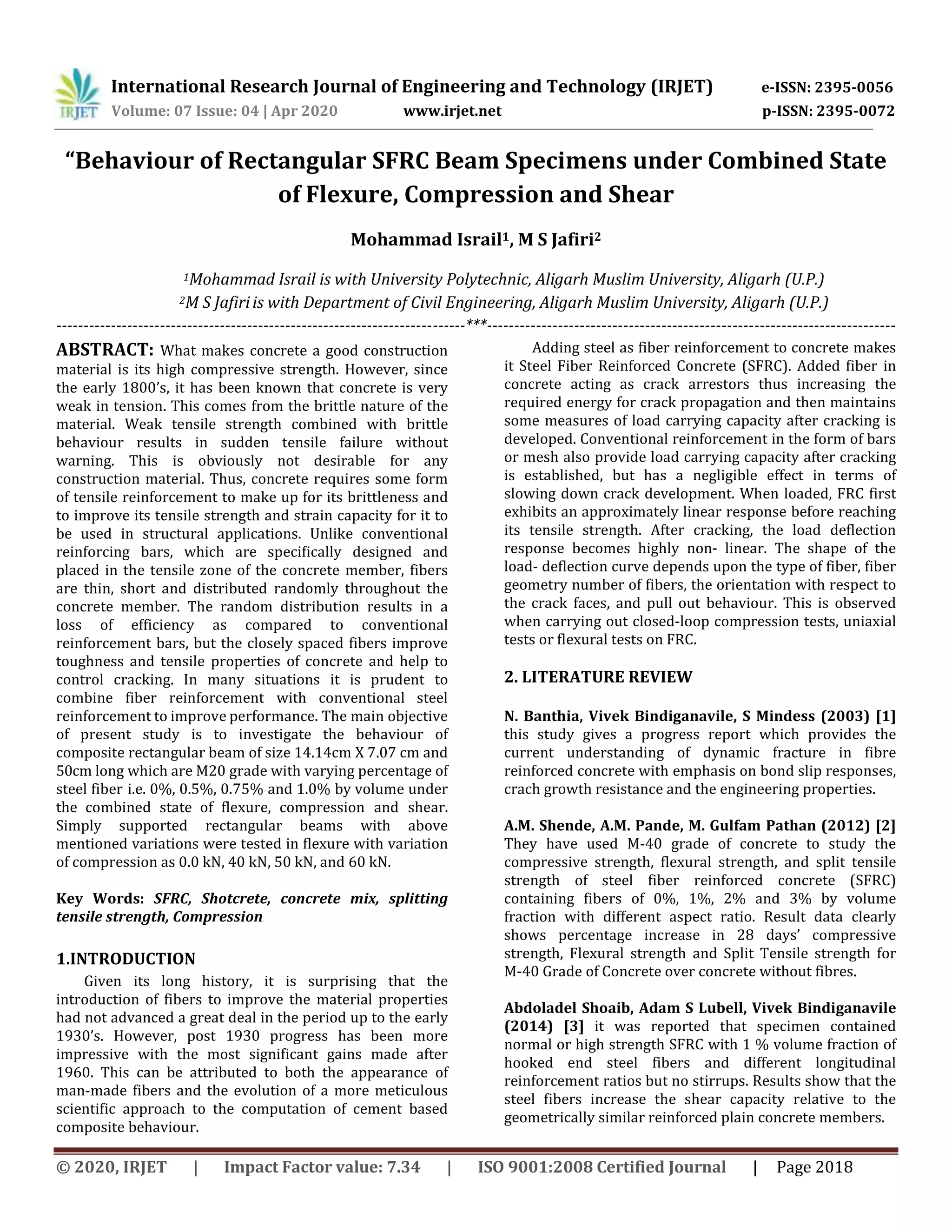 This document summarizes a study that investigated the behavior of steel fiber reinforced concrete (SFRC) beams under combined flexure, compression, and shear loading. Rectangular SFRC beams of varying fiber content (0%, 0.5%, 0.75%, 1% by volume) were tested. Beams were subjected to four levels of compression (0 kN, 40 kN, 50 kN, 60 kN) and flexural loading. Test results found that as fiber content and compression level increased, ultimate bending strength and deflection increased. The ductility of beams also increased with higher fiber content and compression. Including steel fibers improved the compressive strength, splitting tensile strength, and flexural behavior of the concrete