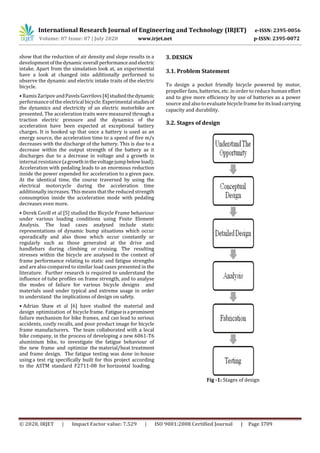 This document describes the design of a blade propelled bicycle that uses electric motors, propeller fans, and batteries to reduce the human effort required to ride a bicycle. The researchers first performed calculations to determine the power, torque, thrust, and blade size required. They then designed the bicycle frame and added mounts for the motors, batteries, and other components. Finite element analysis was used to analyze stresses on the frame under loading conditions. The bicycle is designed to operate in either a pedal-assist mode, where the motors provide power when pedaling, or a battery-only mode, where the rotating propeller fans powered by batteries provide thrust to move the bicycle without pedaling. The goal of the design is to create a