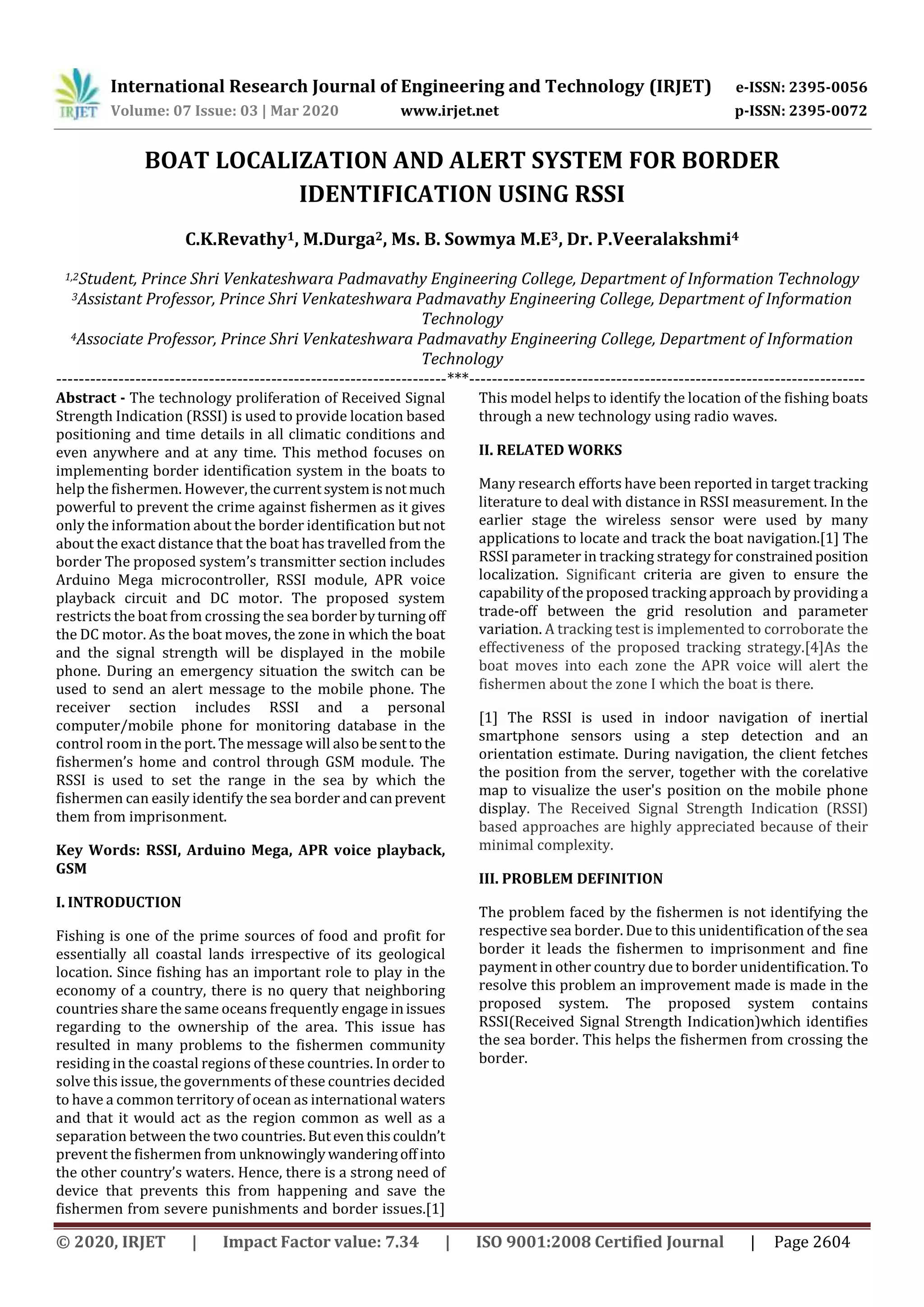 This document presents a boat localization and alert system that uses Received Signal Strength Indication (RSSI) to identify borders and alert fishermen. The system includes an RSSI module, Arduino microcontroller, audio playback circuit and motor to restrict boats from crossing borders. It detects the boat's zone and sends alerts. An emergency switch can send alerts to notify authorities. RSSI is used to set ranges to help fishermen identify borders and prevent imprisonment for accidentally crossing. The system design and working principle are described, including border identification, indication, information transmission and alerts. It aims to safely guide fishermen and resolve issues at borders.