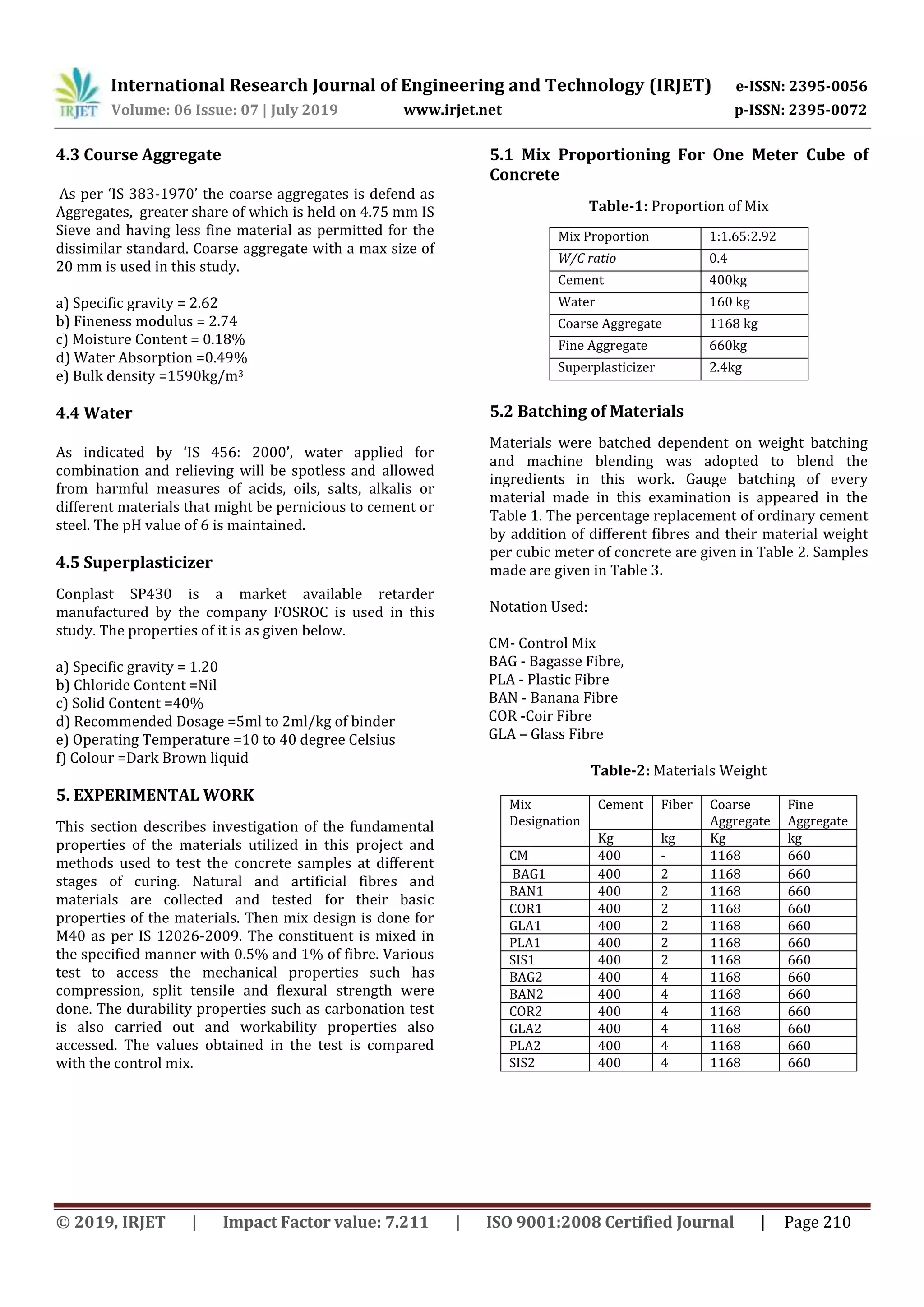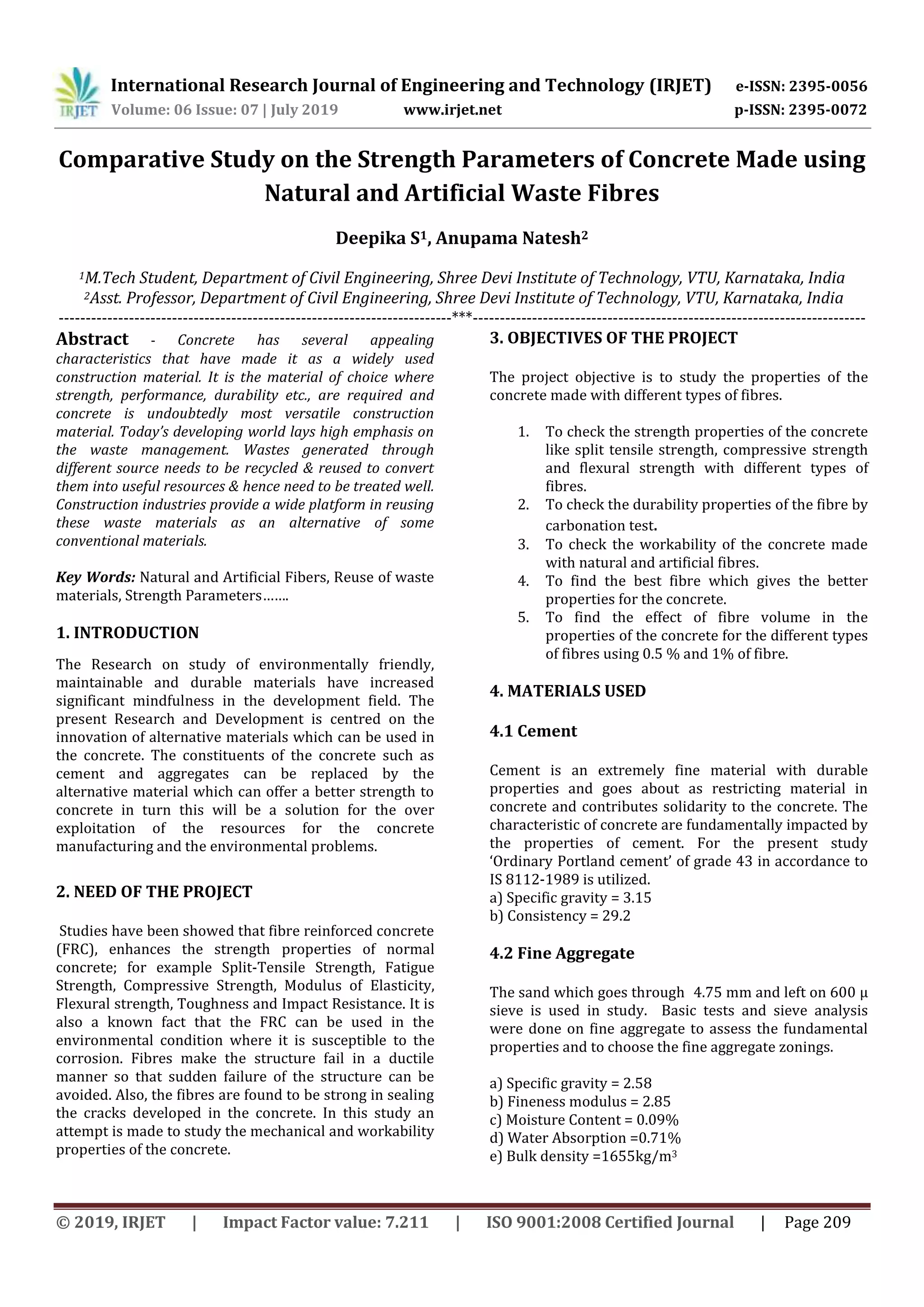 This document summarizes a study on the strength properties of concrete made with natural and artificial waste fibers. The study aimed to compare the compressive strength, split tensile strength, flexural strength, durability, and workability of concrete containing different fiber types at 0.5% and 1% volume fractions. Materials tested included bagasse, banana, coir, glass, and plastic fibers. Results showed that fiber-reinforced concrete had higher strength properties than plain concrete and that strength generally increased with higher fiber content. Glass fiber concrete exhibited the highest strength while coir fiber concrete was the lowest but still stronger than plain concrete.