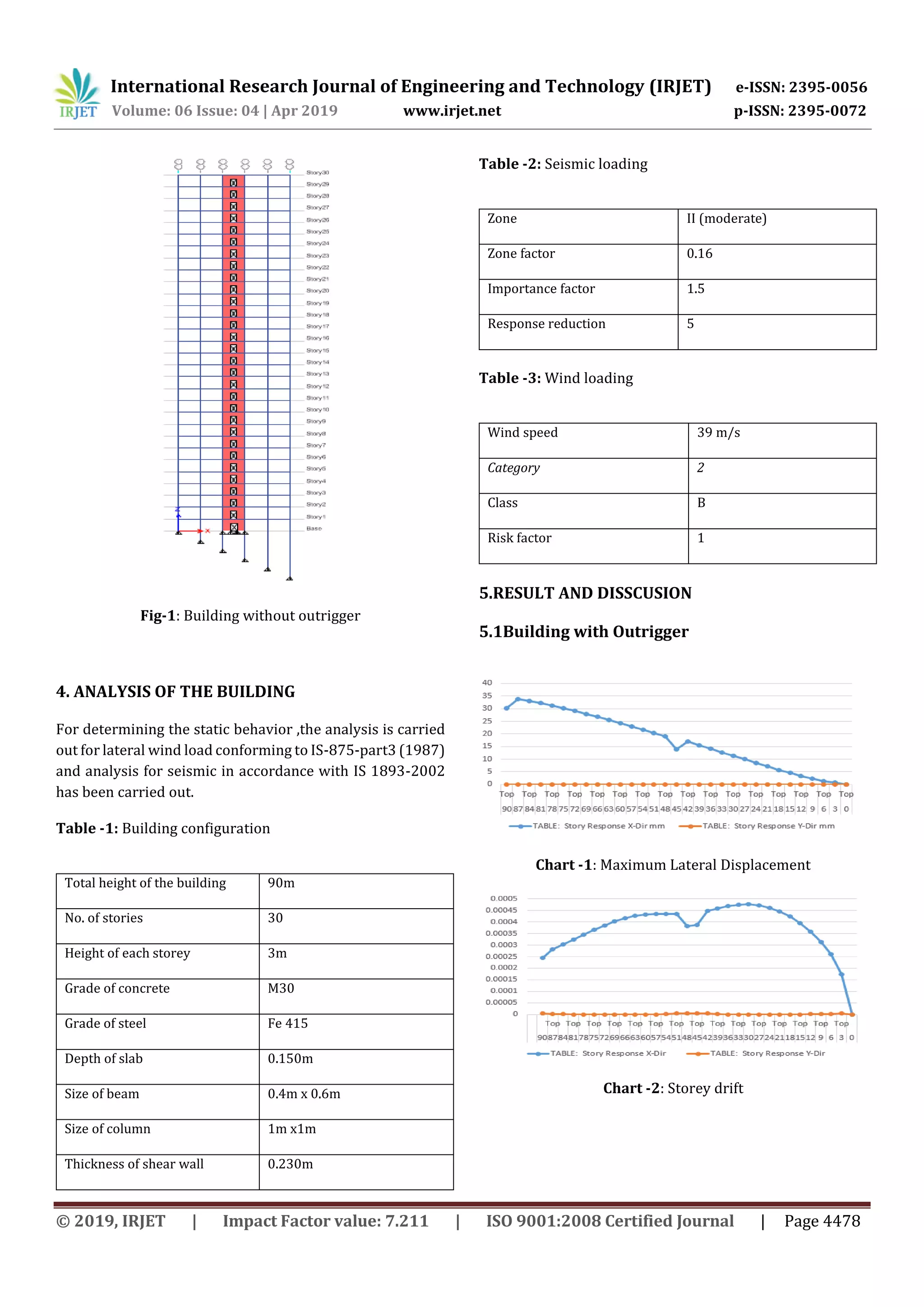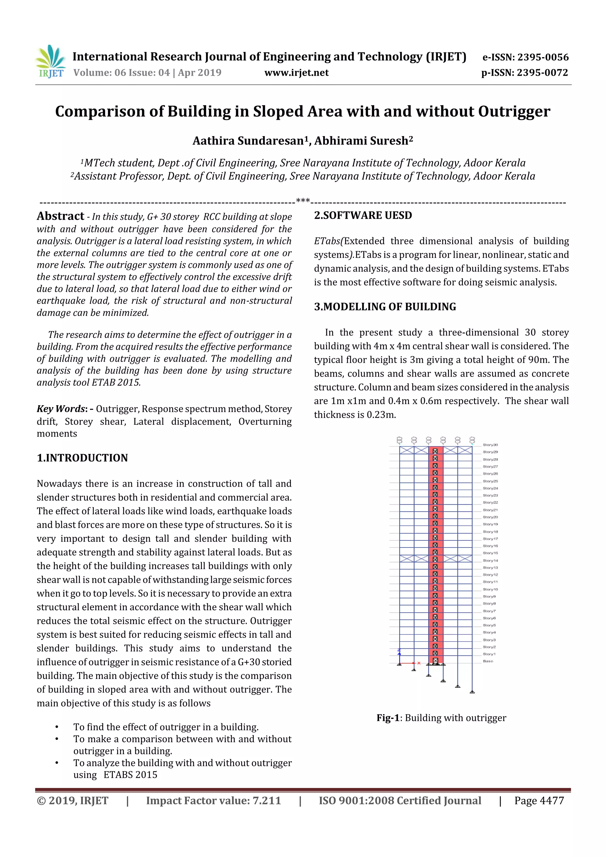 This study analyzes a 30-story reinforced concrete building located on a slope, with and without an outrigger system. An outrigger system ties the external columns to the central core at one or more levels to help control drift under lateral loads like wind and earthquakes. The building was modeled and analyzed using ETABS software. Results showed that with an outrigger, the building experienced approximately 20% less lateral displacement, 12% less story drift, 32% less overturning moment, 24% less story shear, and 23% more stiffness. Therefore, the outrigger system significantly improved the building's performance under lateral loads.