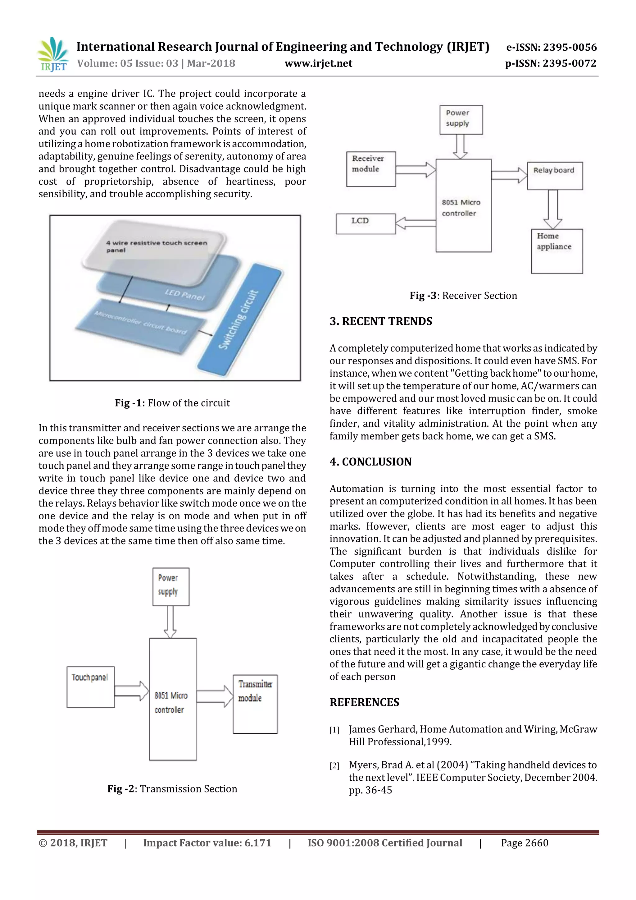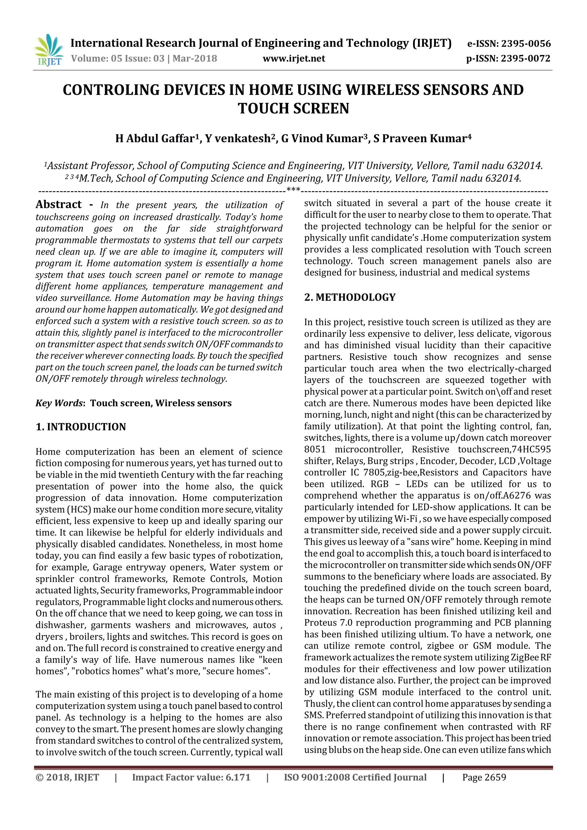 This document describes a home automation system that uses a resistive touch screen and wireless sensors to control devices in the home. A microcontroller is interfaced with the touch screen to send on/off commands wirelessly to receiver modules connected to loads like lights and fans. The touch screen allows users to control devices grouped by function (morning, evening, etc). The system was designed and tested using simulation software. It aims to provide convenient centralized control of home appliances to help elderly and disabled people.